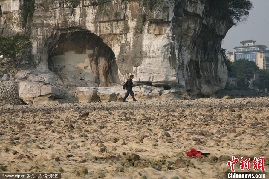 2010年11月4日,廣西桂林,象鼻山前干涸的河床。入秋以來(lái),桂林持續(xù)干旱,漓江水位下降,進(jìn)入秋冬枯水期。李凱 攝 圖片來(lái)源:CFP視覺(jué)中國(guó)