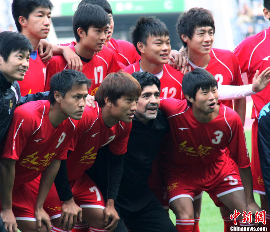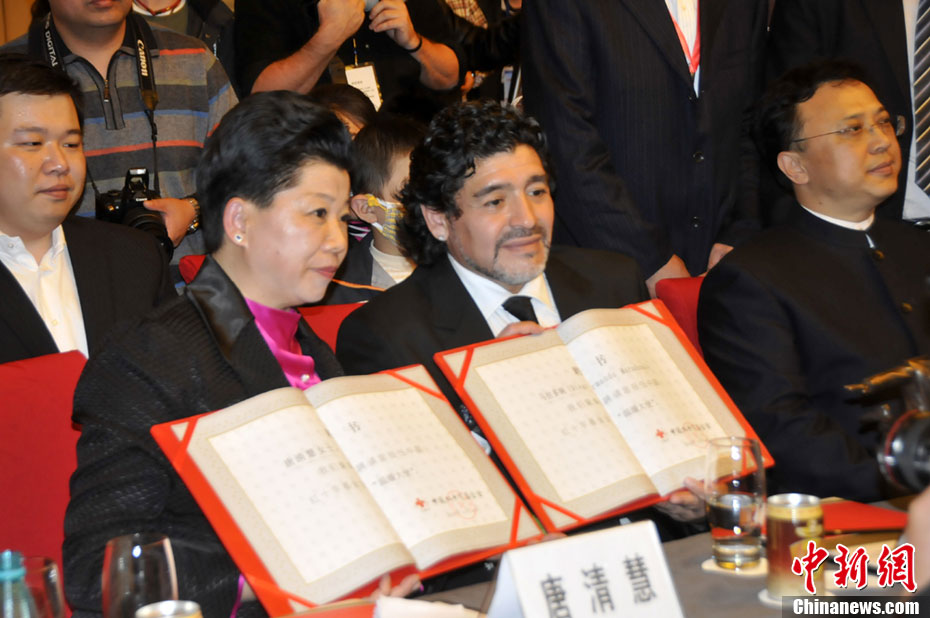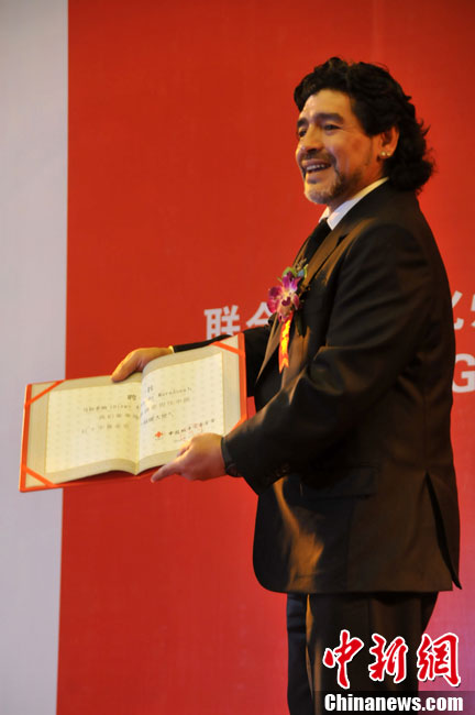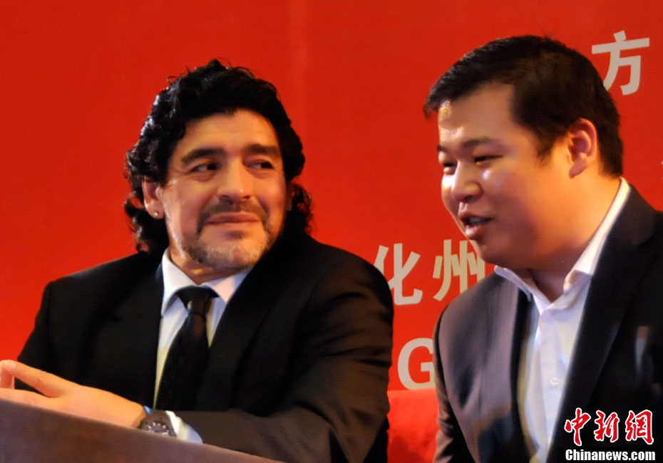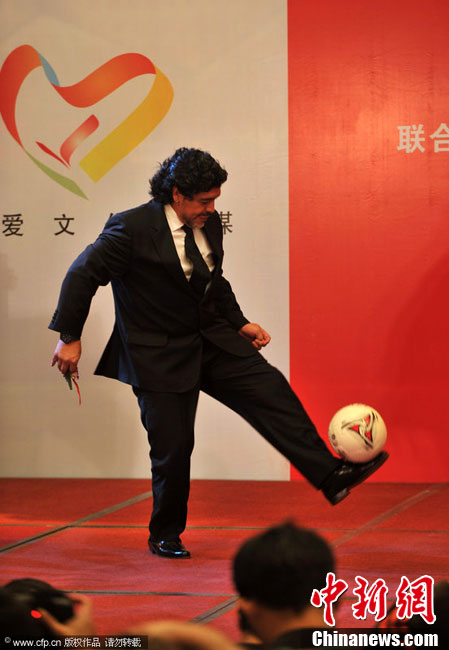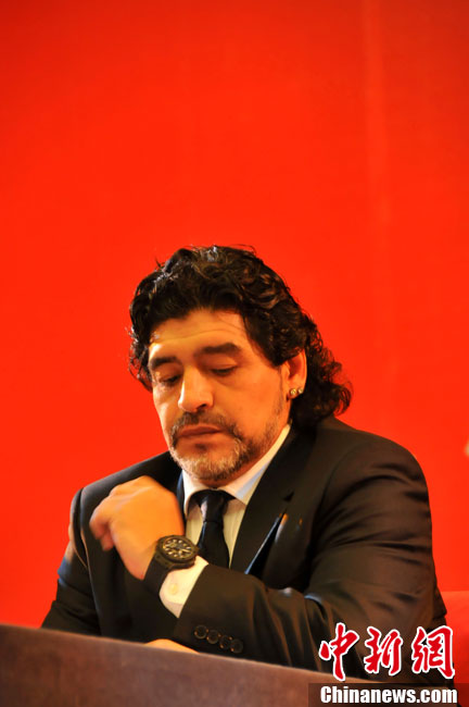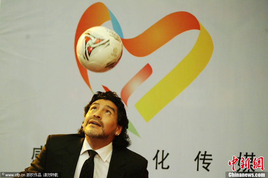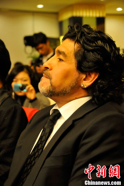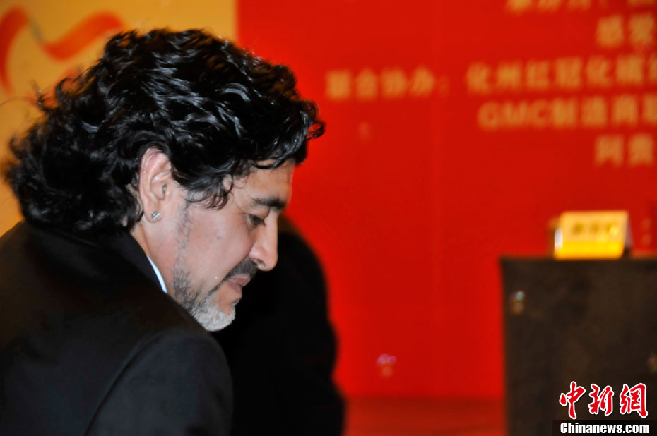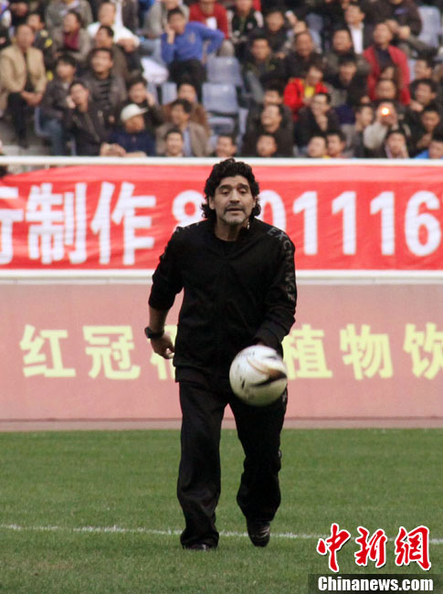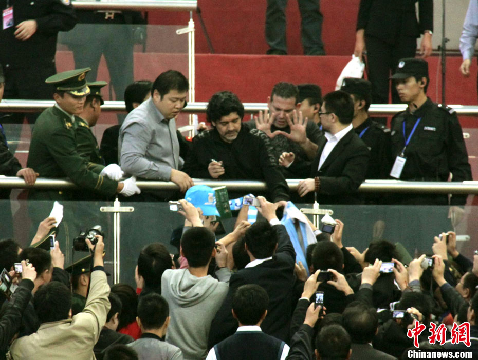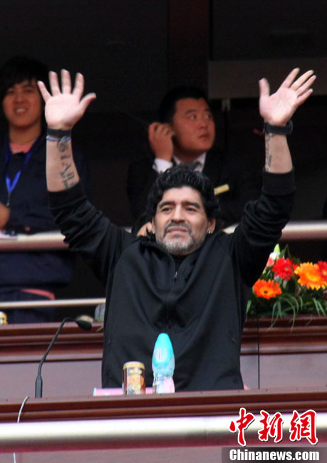 11月5日下午16時(shí)左右,世界球王馬拉多納來(lái)到山東濟(jì)南奧體中心參加山東聯(lián)隊(duì)與阿根廷明星隊(duì)的慈善比賽。圖為馬拉多納向現(xiàn)場(chǎng)的觀眾和球迷揮手致意。中新社發(fā) 牛杰峰 攝