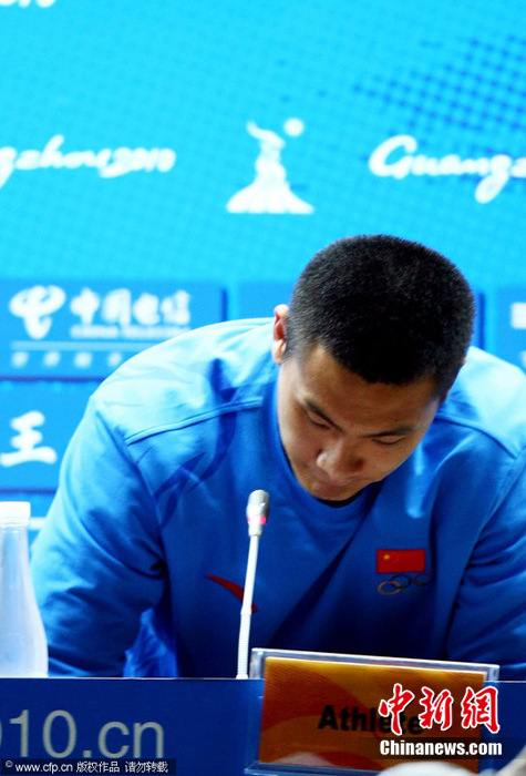 2010年11月10日,廣州,2010亞運會男足A組次輪,中國Vs吉爾吉斯斯坦。王大雷出席賽后新聞發(fā)布會,就此前在微博上辱罵球迷的行為道歉。圖片來源:CFP視覺中國
