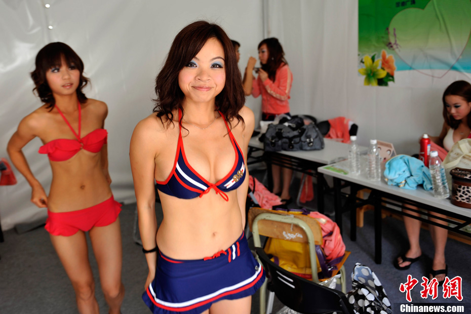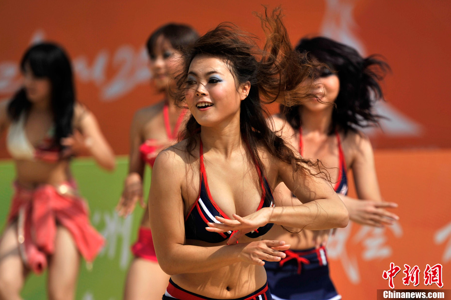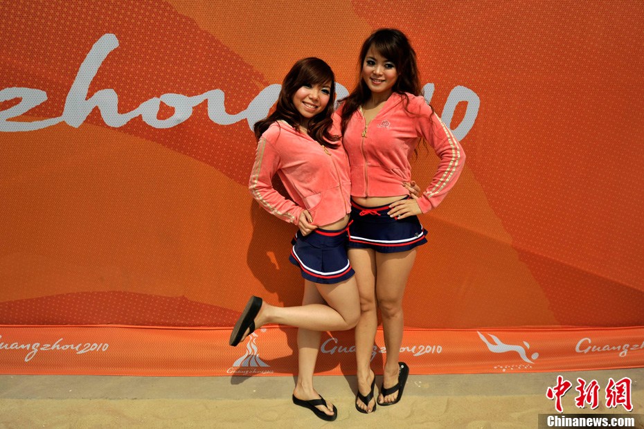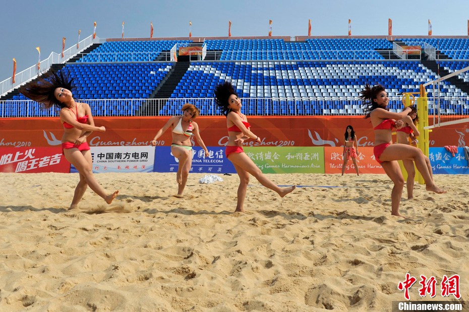 11月11日,熱情洋溢的“沙灘寶貝”身著比基尼在廣州亞運(yùn)會(huì)沙灘排球館主賽場(chǎng)進(jìn)行訓(xùn)練。比賽期間,沙灘排球場(chǎng)將有4支啦啦隊(duì)進(jìn)行現(xiàn)場(chǎng)表演。中新社記者 金碩 攝