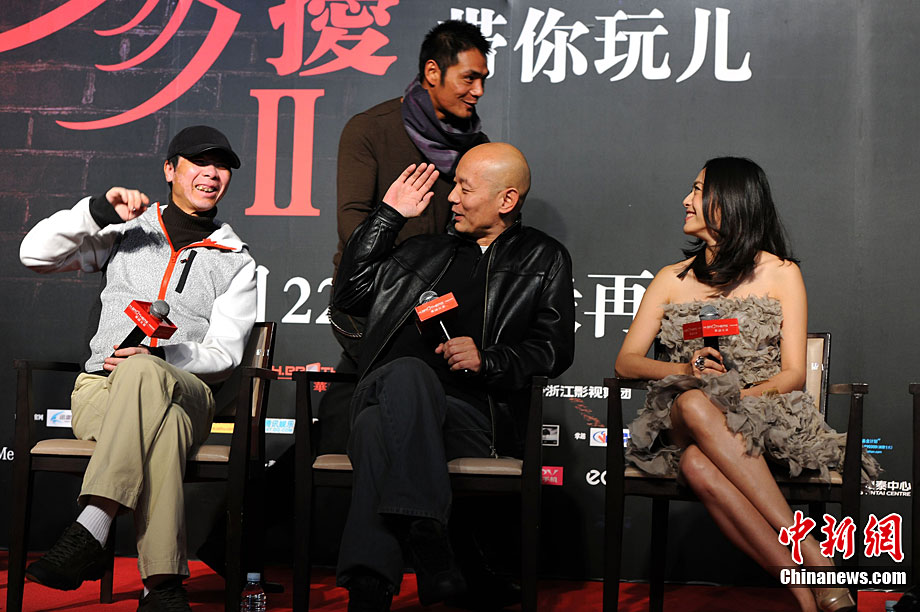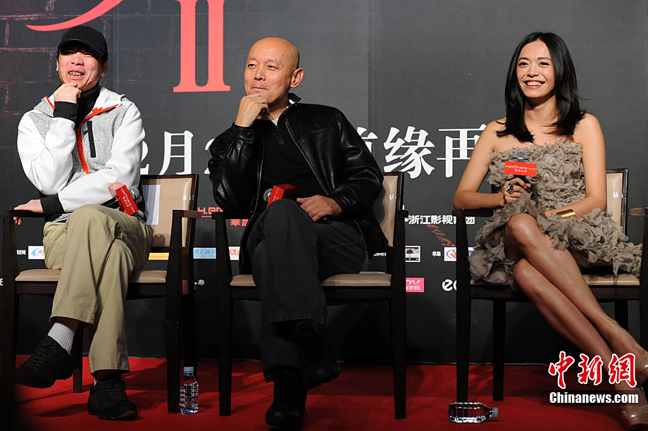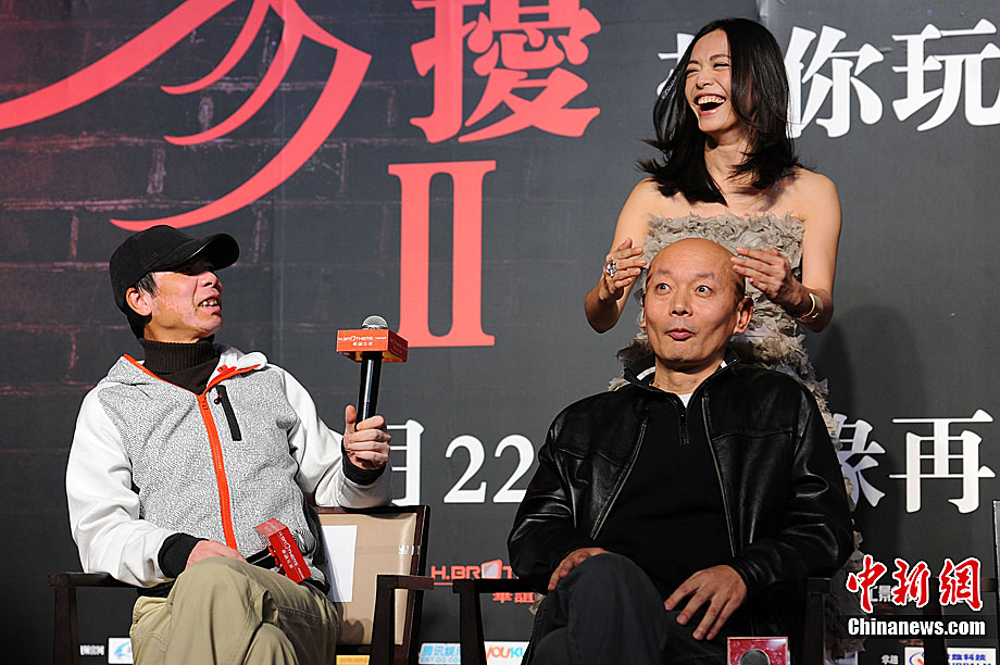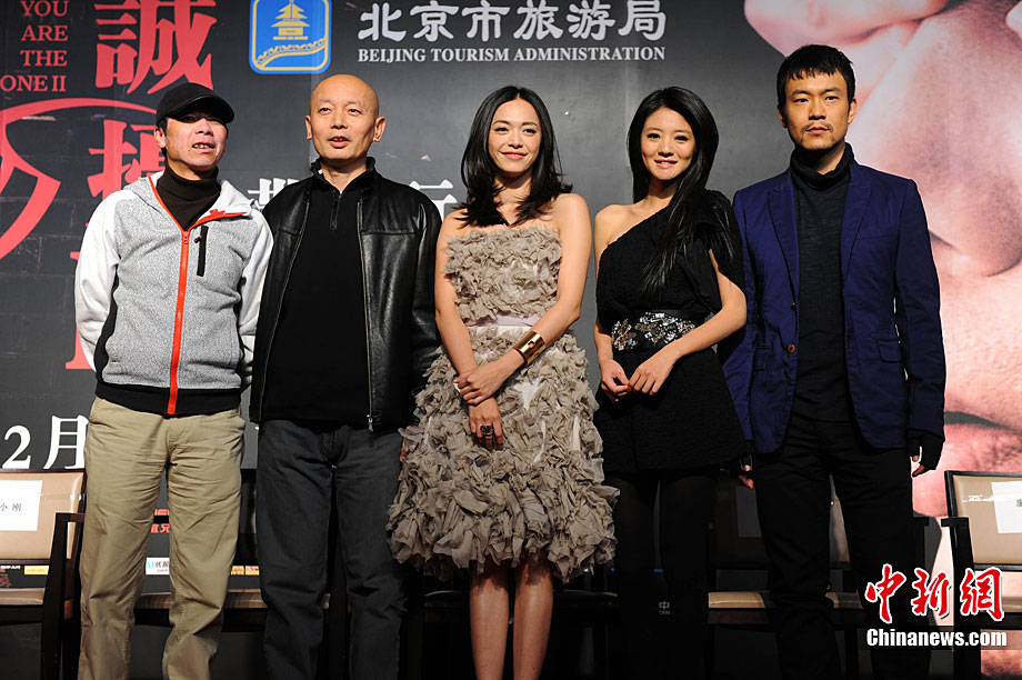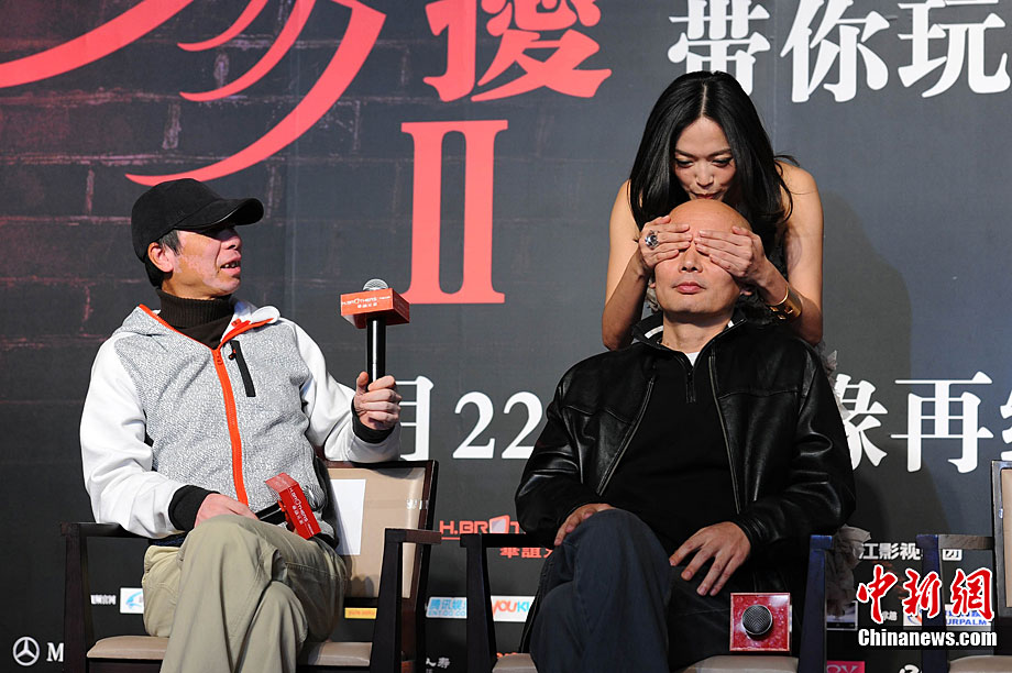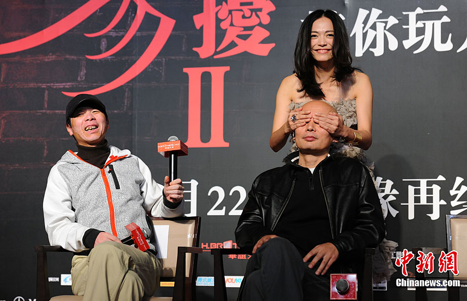 11月14日,將于12月22日賀歲上映的《非誠勿擾2》在北京舉行發(fā)布會,發(fā)布電影的美景花絮,并隆重介紹本次影片與北京市旅游局的合作。發(fā)布會上,除主演葛優(yōu)外,姚晨、安以軒、廖凡、邵兵并未參演前作《非誠勿擾》的拍攝,這也是續(xù)集新成員的第一次集體亮相。發(fā)布會上馮小剛導演證實,“《非誠勿擾2》海報上蒙葛優(yōu)眼睛的手是姚晨的!爆F(xiàn)場媒體要求姚晨與葛優(yōu)情景重現(xiàn),盡管姚晨笑說,她跟舒淇是好姐妹,不能在人不在的時候占秦奮便宜。但還是難以抵擋眾人要求盛情難卻,現(xiàn)場蒙住了葛優(yōu)雙眼并送上香吻,葛優(yōu)事后享受地說“不錯”。中新社記者 李學仕 攝