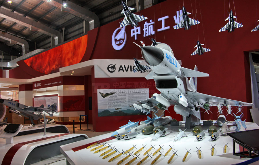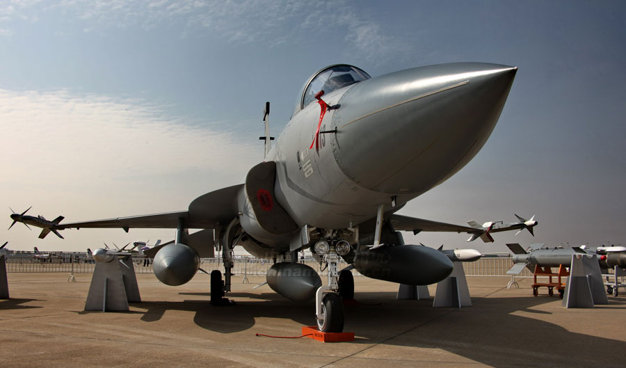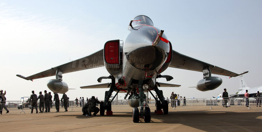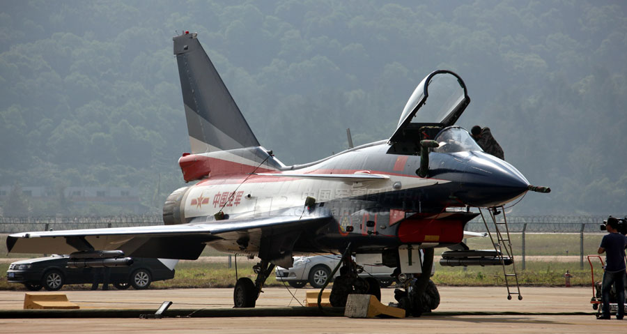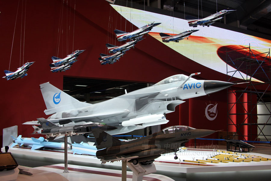 11月14日,參加第8屆中國國際航空航天博覽會的各場館基本布置就緒。圖為殲10表演機。圖片來源:中國軍網(wǎng) 喬天富 攝