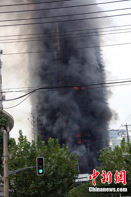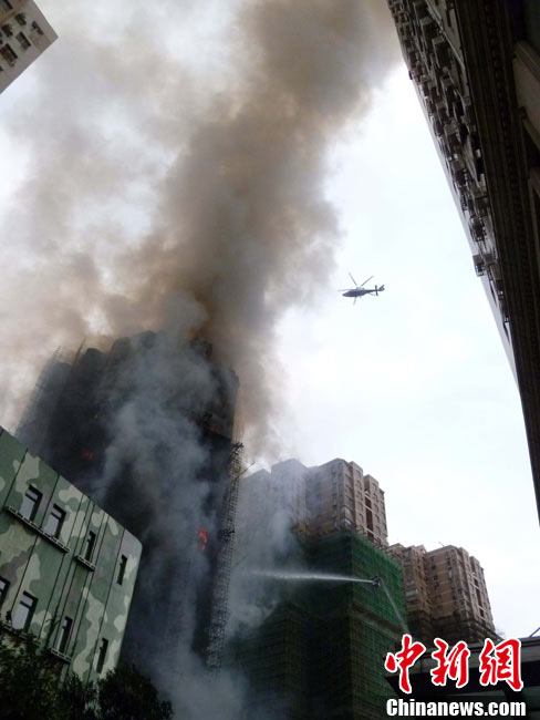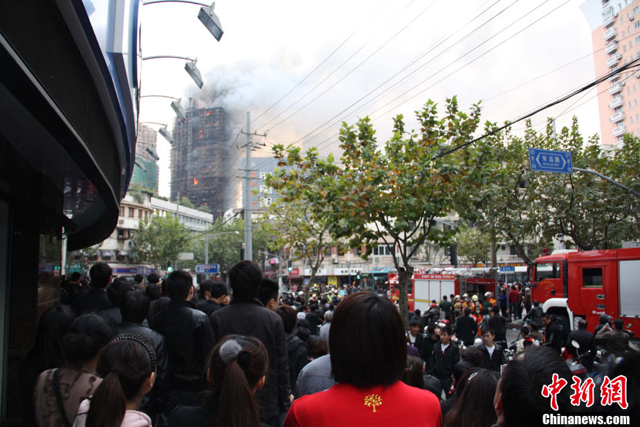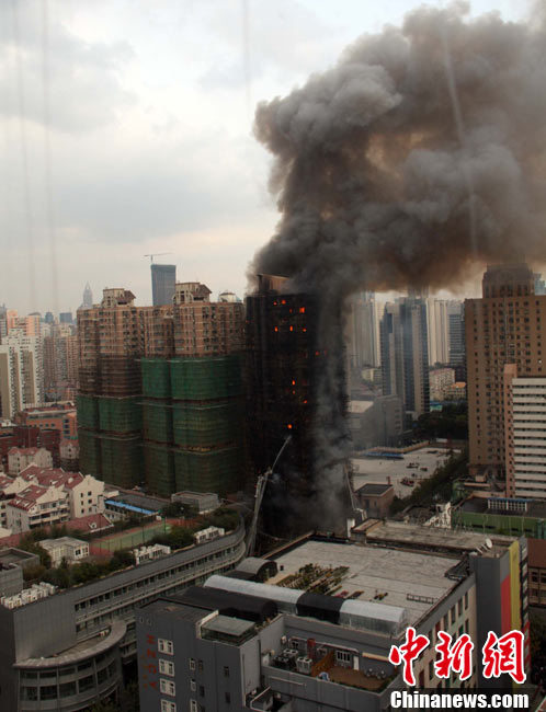 11月15日下午2時15分,上海中心城區(qū)靜安區(qū)正在進(jìn)行外墻裝修的教師公寓的腳手架起火,火警發(fā)生后,公安民警、消防隊(duì)員迅速趕往現(xiàn)場救援,到場消防車超過10輛。起火原因和損失狀況正在進(jìn)一步調(diào)查中。中新社發(fā) 張嘉森 攝