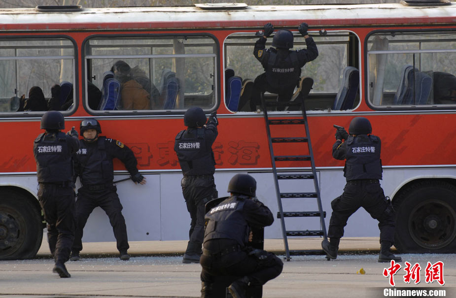 11月16日,河北石家莊特警、治安警、刑警、武警、交警、消防等多警種聯(lián)動(dòng),舉行代號(hào)為“紅箭突擊——2010”大型反恐處突應(yīng)急拉動(dòng)演練。據(jù)指揮部有關(guān)負(fù)責(zé)人介紹,此次演練從實(shí)戰(zhàn)出發(fā),主要分為參演隊(duì)伍分列式和處突實(shí)兵演練,以檢驗(yàn)重大案(事)件應(yīng)急處突力量的協(xié)同配合和處置能力。圖為特警“解救”客車上的游人。中新社發(fā) 劉志敏 攝