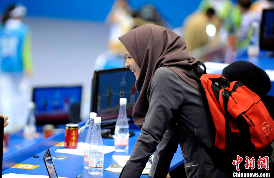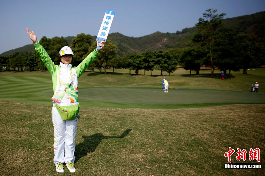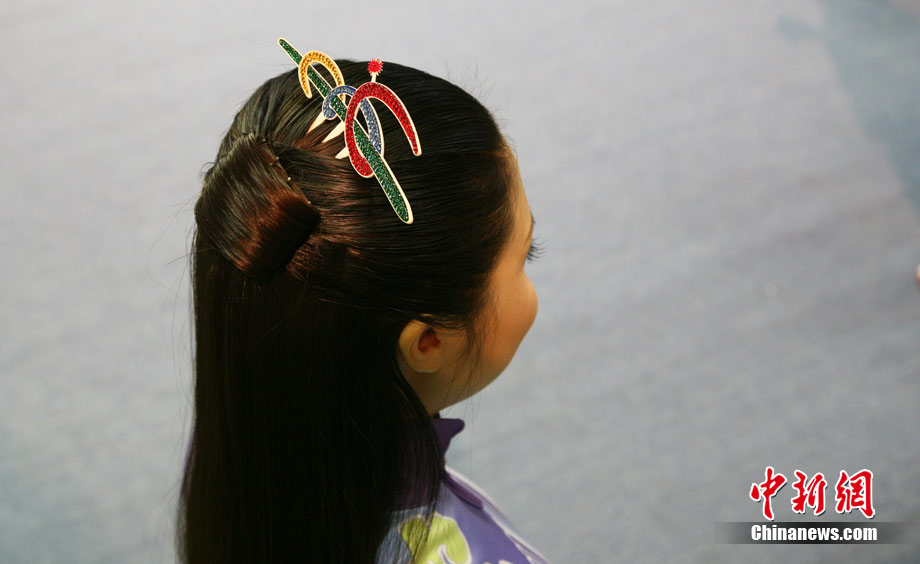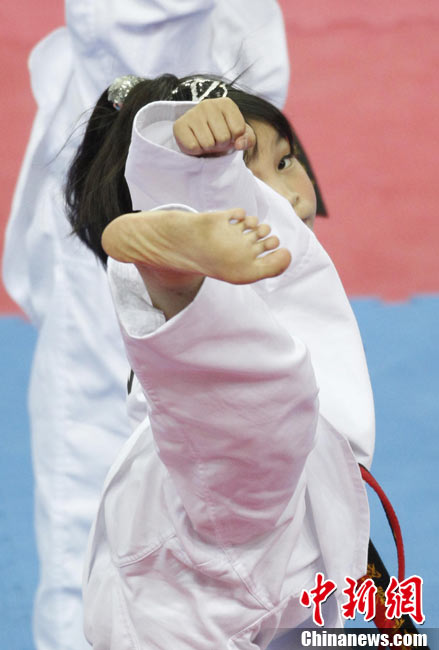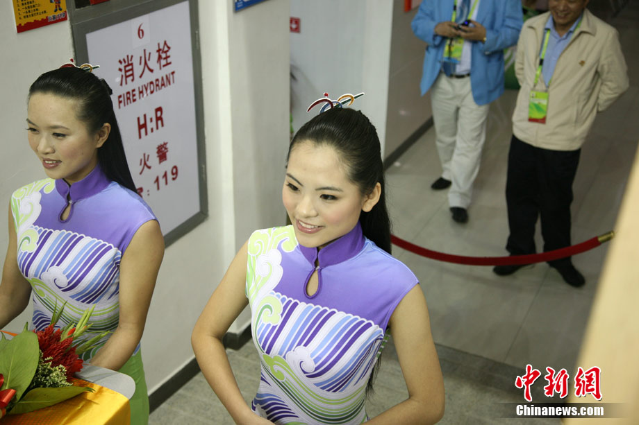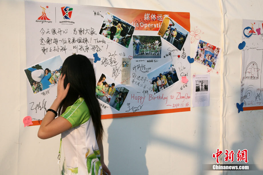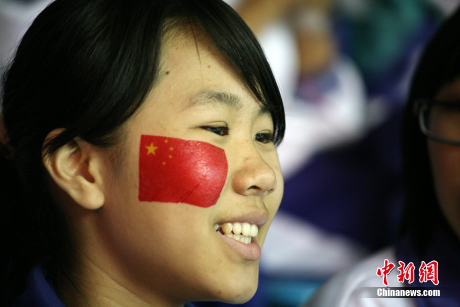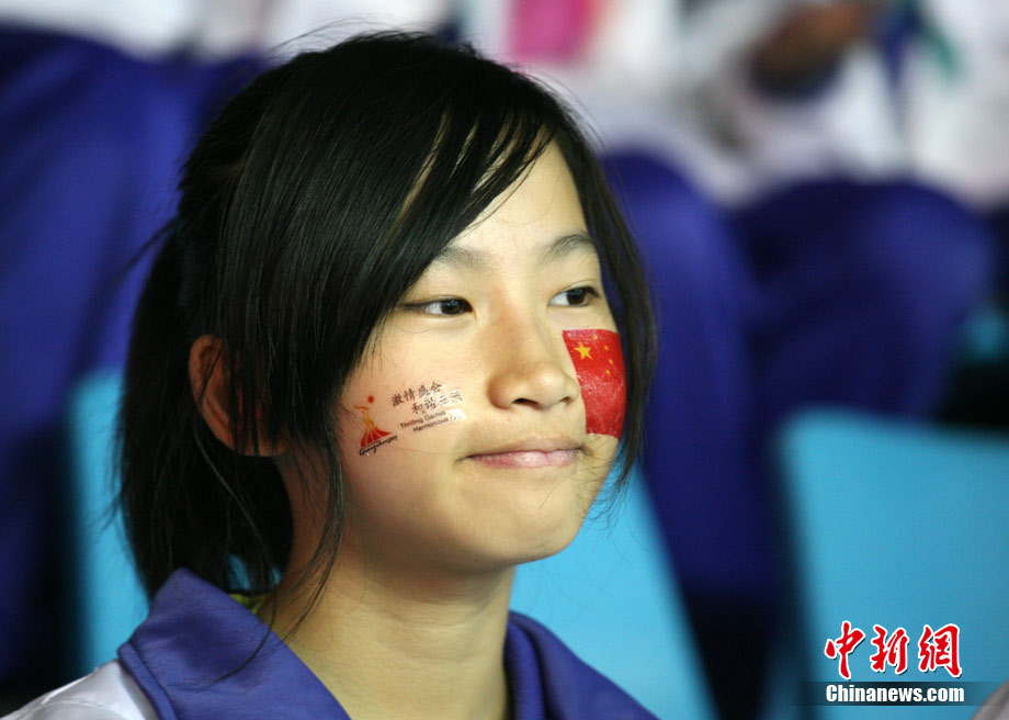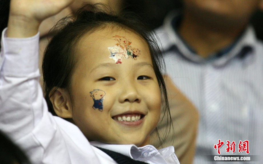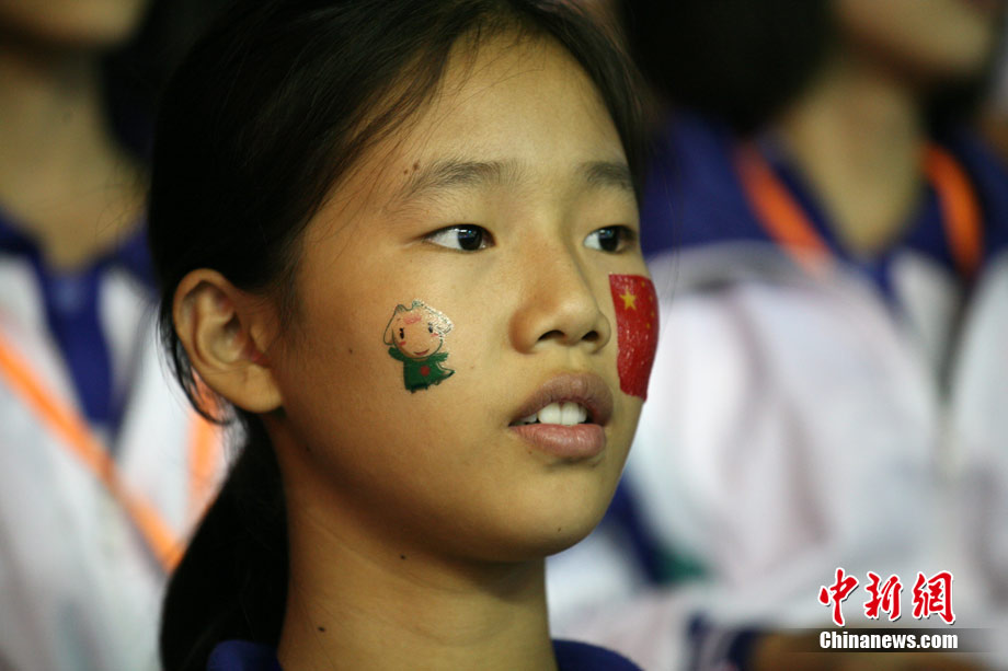 11月17日,2010廣州亞運會舉重賽場的看臺上,孩子們臉上貼著亞運標志觀看比賽。中新社記者 張茵 攝