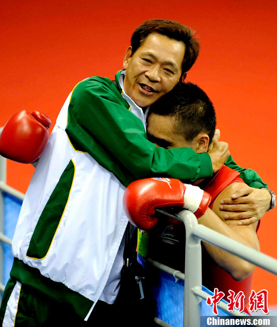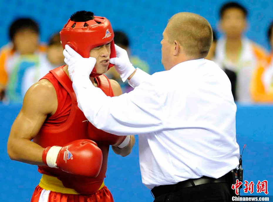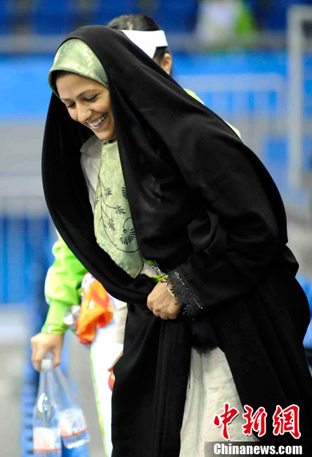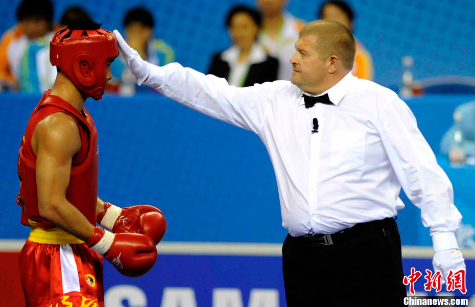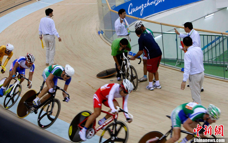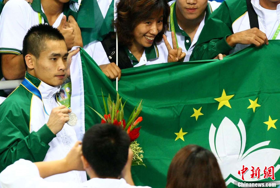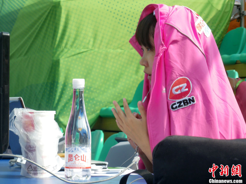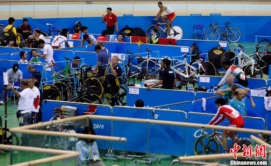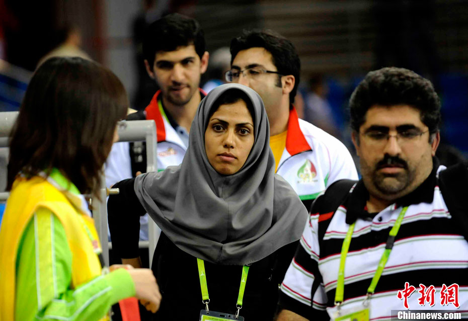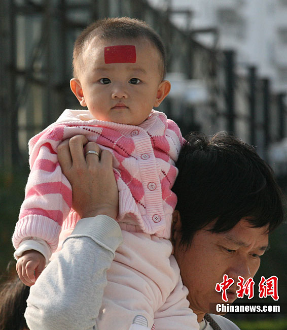 11月17日,2010廣州亞運會舉重賽場的看臺上,孩子們臉上貼著亞運標志觀看比賽。中新社記者 張茵 攝