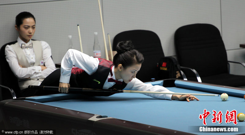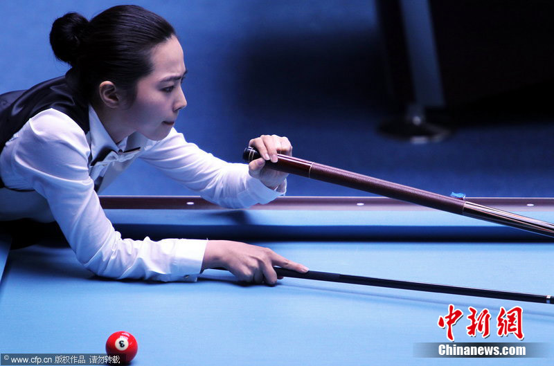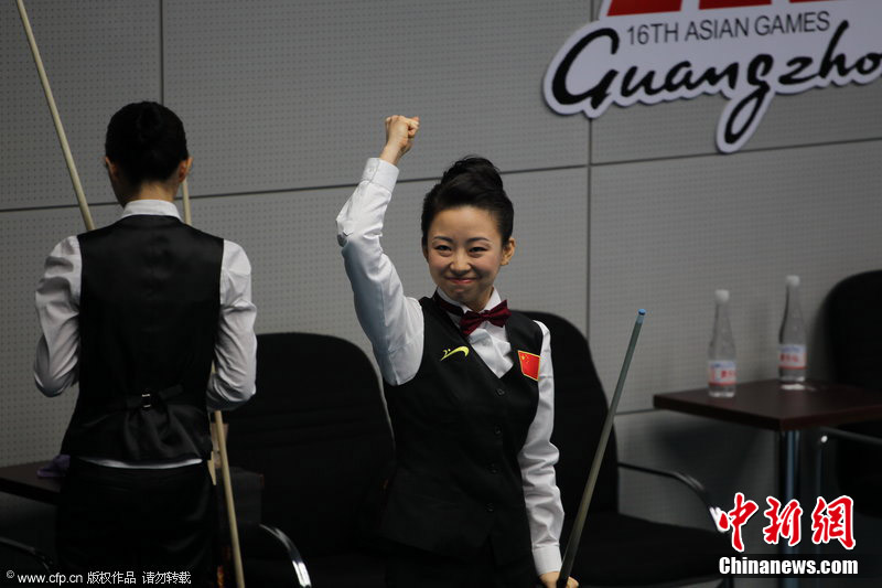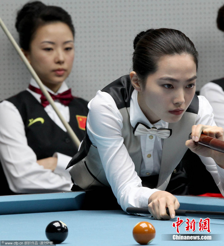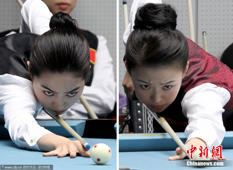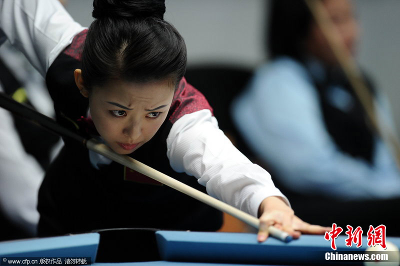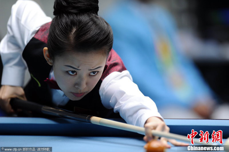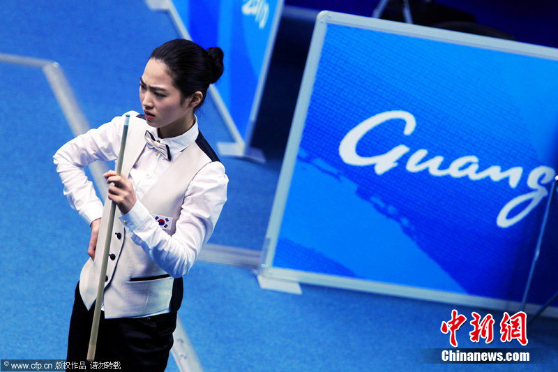 11月18日,2010廣州亞運(yùn)會女子美式9球單打1/4決賽,兩位公認(rèn)的臺壇美女展開激烈爭奪,最終,中國選手潘曉婷以7:6的最終比分戰(zhàn)勝韓國的車侑藍(lán)(車俞嵐)晉級下一輪。圖片來源:cfp視覺中國