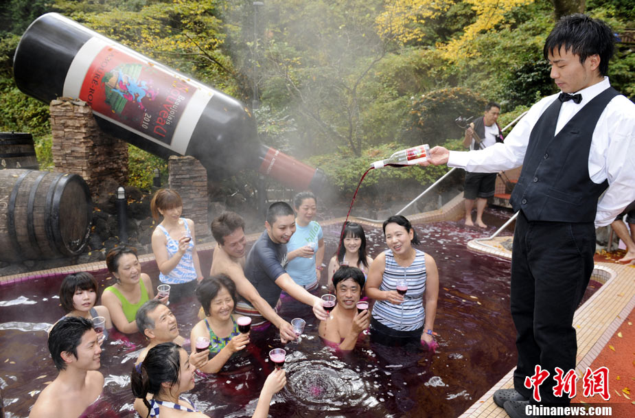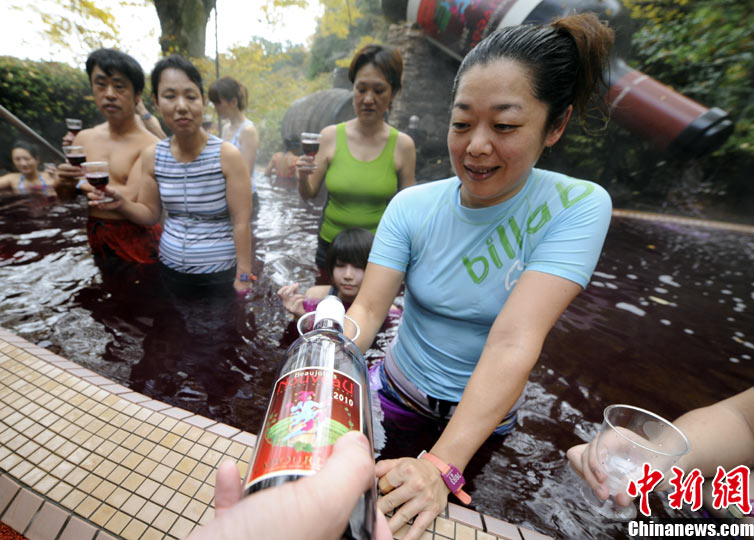 11月18日,一年一度的法國(guó)“博若萊”鮮葡萄酒開瓶日到來(lái)。由于時(shí)差原因,日本飲者得以先嘗為快。在日本箱根的小涌園溫泉浴場(chǎng),客人們泡在鮮葡萄酒溫泉中舉杯慶祝。