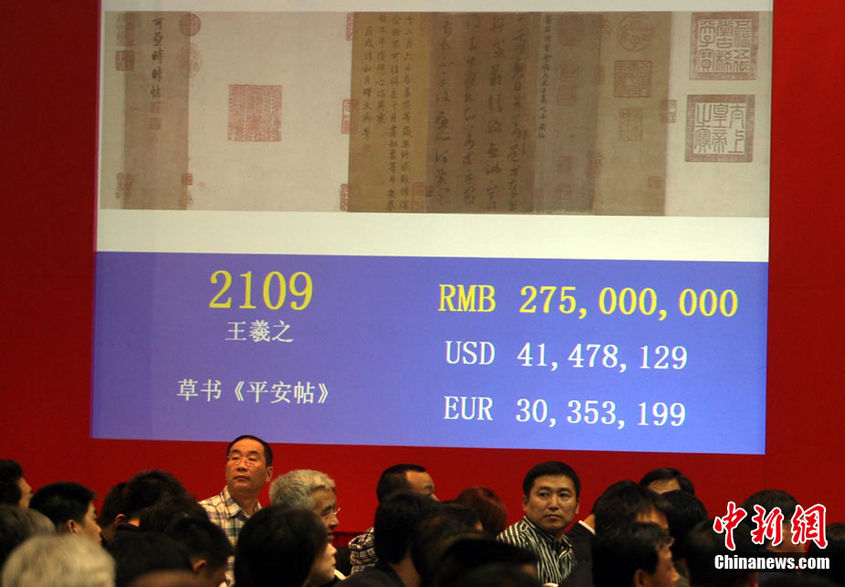 11月20日晚,在中國嘉德2010秋季拍賣會“秋光萬華——清代宮廷藝術(shù)集粹”專場中,王羲之草書《平安帖》以人民幣三億零八百萬成交。中新社記者 楊可佳 攝