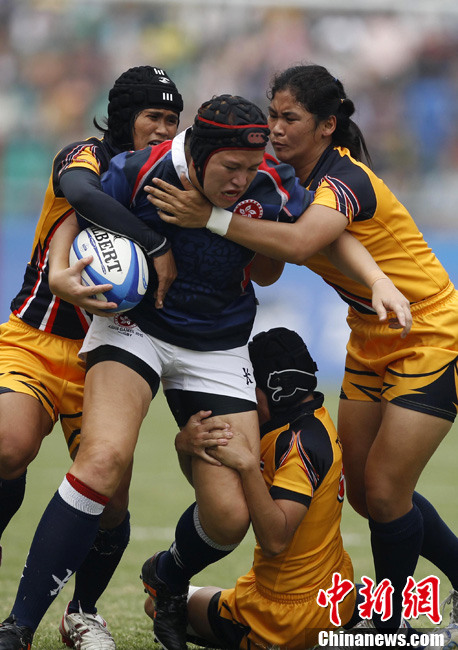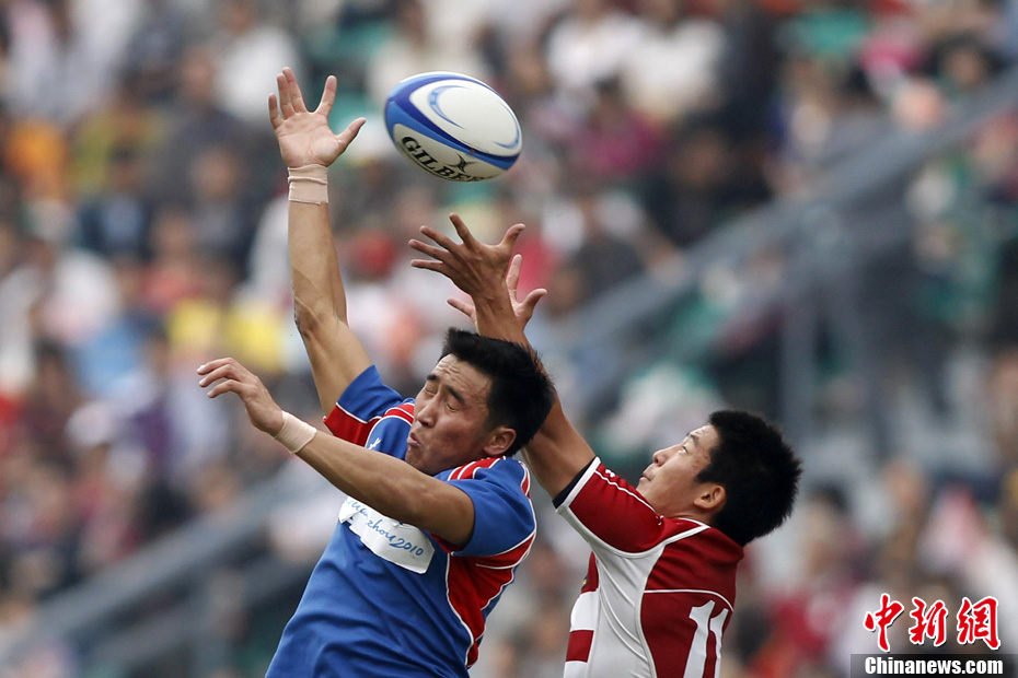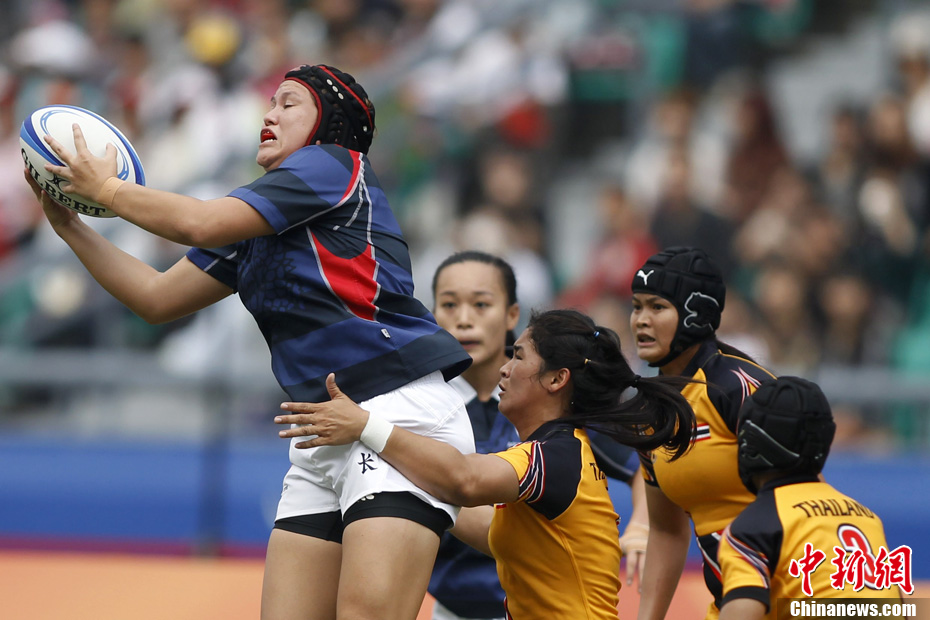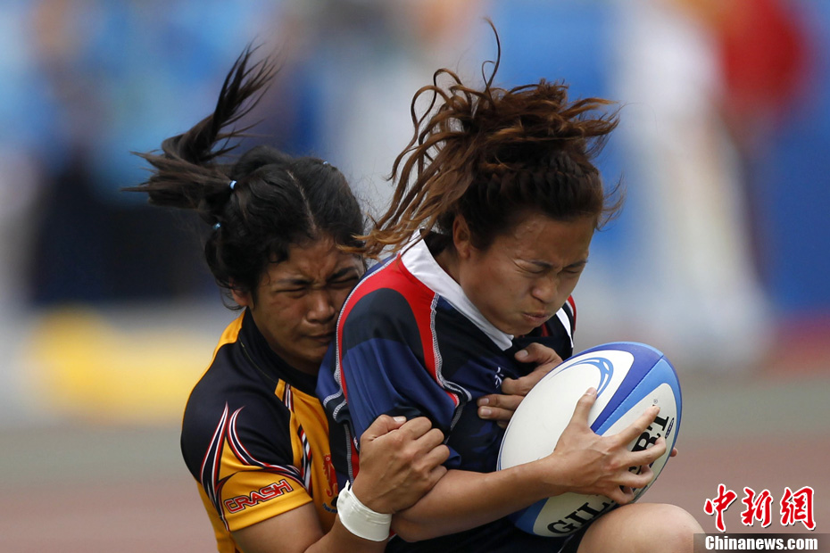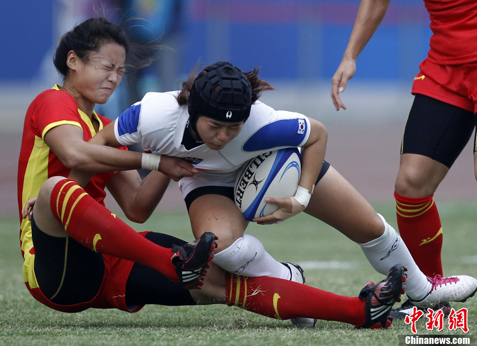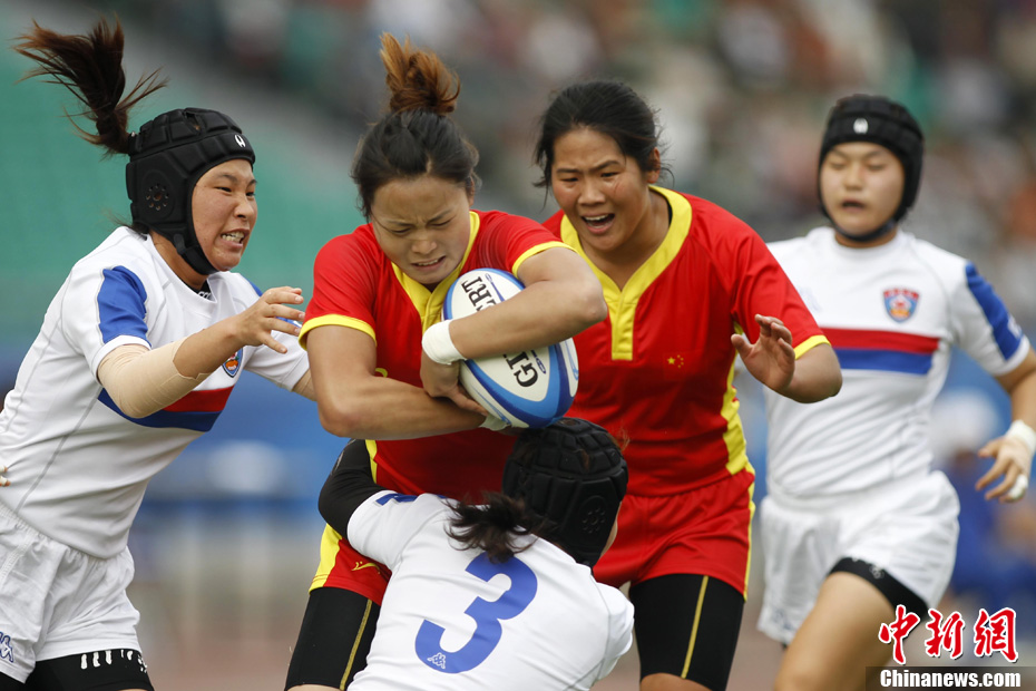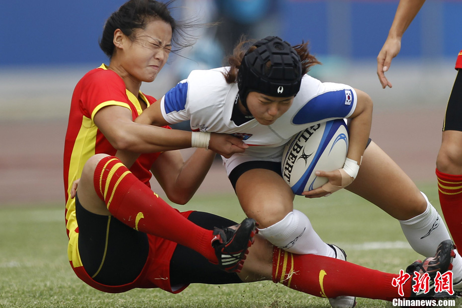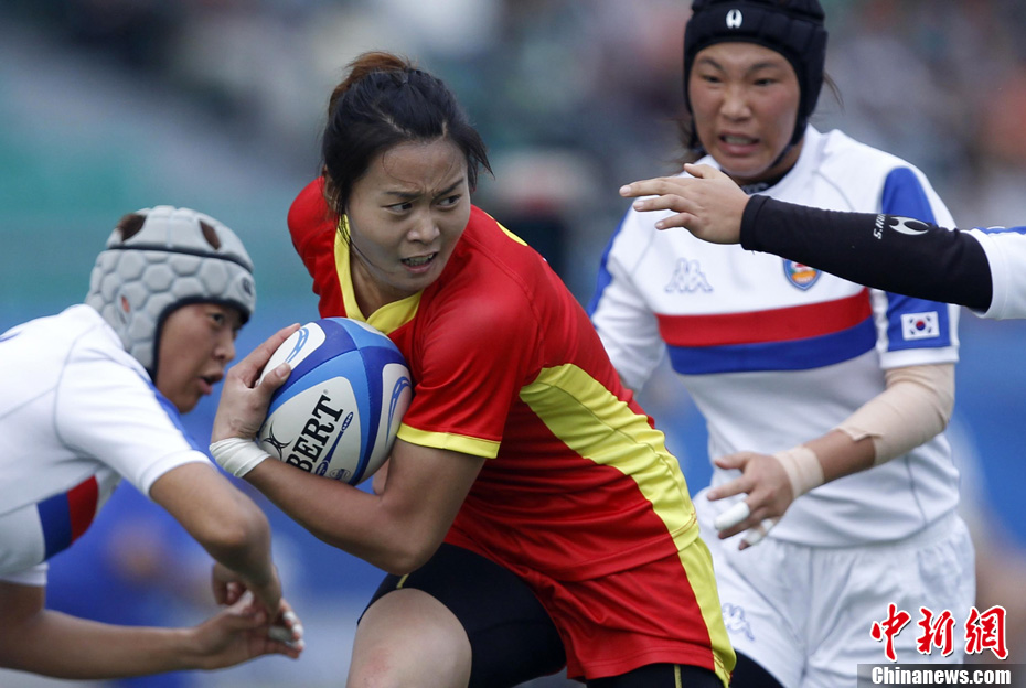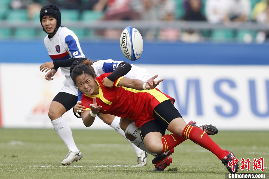 11月21日,廣州亞運(yùn)會(huì)橄欖球比賽拉開帷幕,首場(chǎng)揭幕戰(zhàn)中,中國(guó)女隊(duì)(紅)51比0大勝韓國(guó)女隊(duì)。中新社記者 盛佳鵬 攝