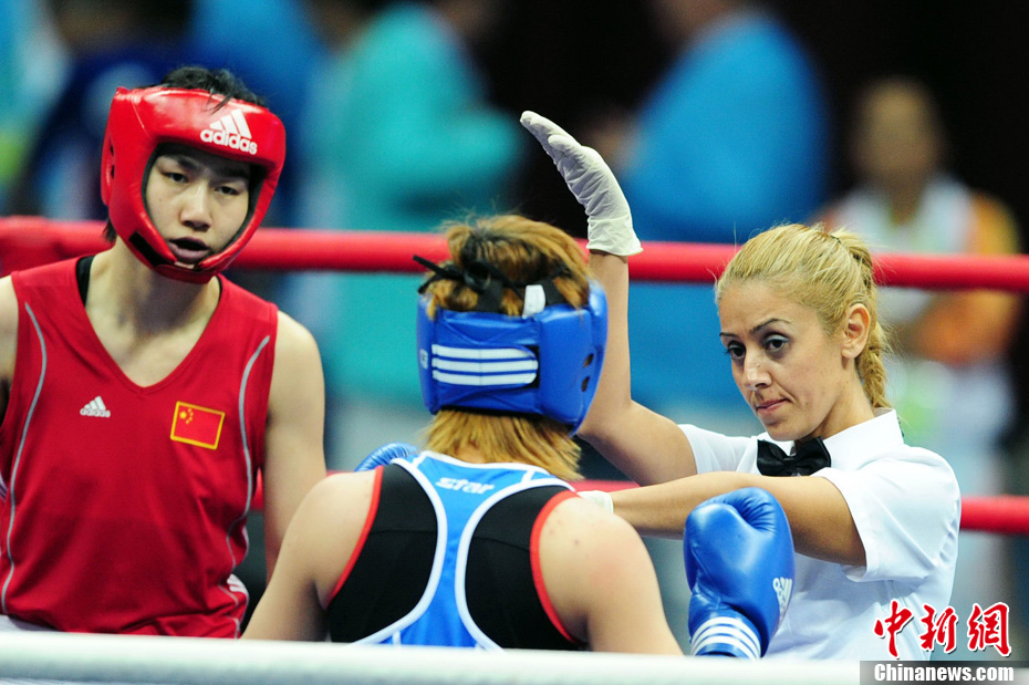 11月21日,在亞運(yùn)拳擊佛山賽場,來自土耳其的美女裁判場醒目裁決、引人注目。中新社記者 陳文 攝