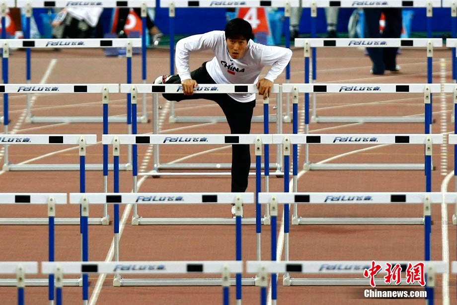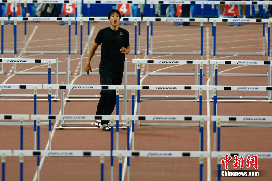 11月22日,廣州亞運會田徑賽場,男子110米欄的預(yù)賽,中國著名運動員劉翔登場亮相。圖為劉翔在進行賽前熱身。中新社記者 富田 攝