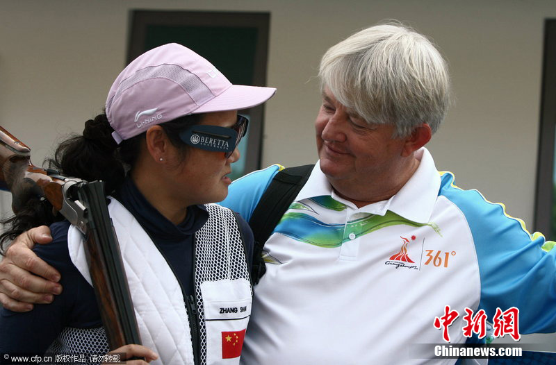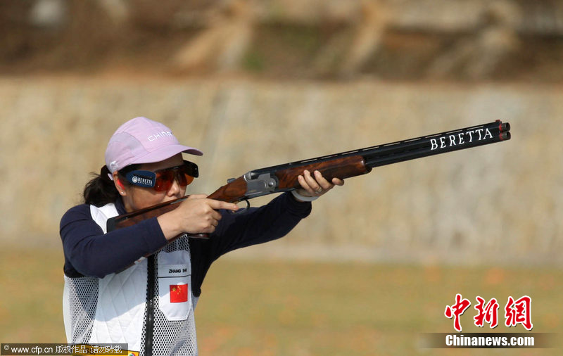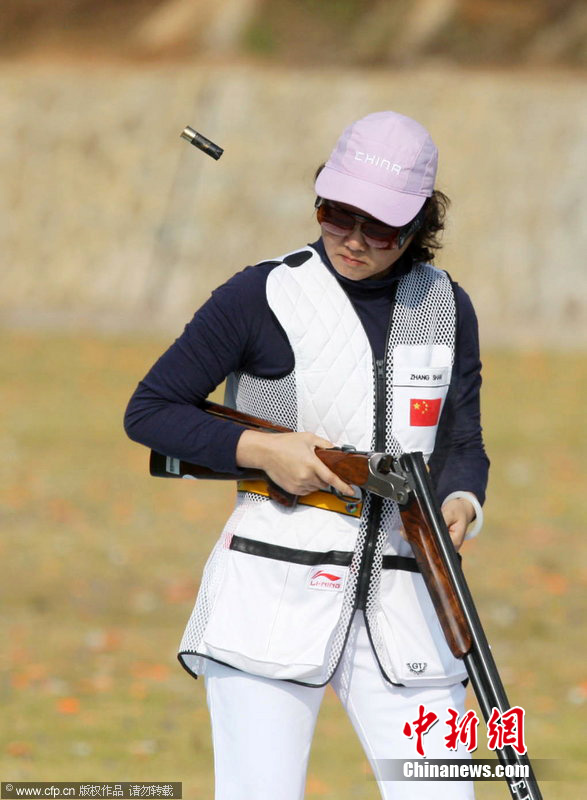 2010年11月23日,廣州亞運(yùn)會(huì)射擊女子雙向飛碟賽場(chǎng),由張山、魏寧、魏萌組成的中國(guó)隊(duì),以較大的優(yōu)勢(shì)奪冠?钢袄蠘尅鄙详嚨膹埳,是唯一參加過在中國(guó)舉辦的兩屆亞運(yùn)會(huì)的運(yùn)動(dòng)員。她甚至放言要參加倫敦奧運(yùn)會(huì)。圖片來(lái)源:cfp視覺中國(guó)