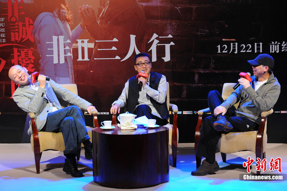 由華誼兄弟出品、馮小剛導演、王朔與馮小剛聯(lián)合編劇的《非誠勿擾2》將于12月22日賀歲上映。11月24日,《非誠勿擾2》舉行了“《非2》三人行”發(fā)布會,正式發(fā)布《非誠勿擾2》升級版幕后花絮,馮小剛、葛優(yōu)、竇文濤組成三人行搭檔。在竇文濤的幽默調侃下,葛優(yōu)馮小剛熱聊新戲,笑聲不斷。在當場公布的升級篇幕后花絮中,秦奮和梁笑笑的親密戲也出露端倪,葛優(yōu)舒淇在美景中多次深情依偎,一場兩人在床上的鏡頭更令人期待。馮小剛承認,“是多了一些親密戲,但都是幽默的處理!备饍(yōu)也謙虛表示,自己演親密戲其實并不拿手。中新社記者 李學仕 攝