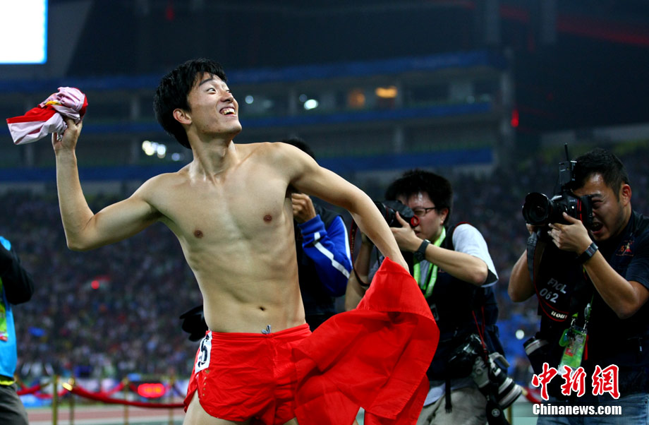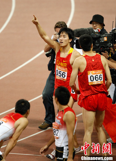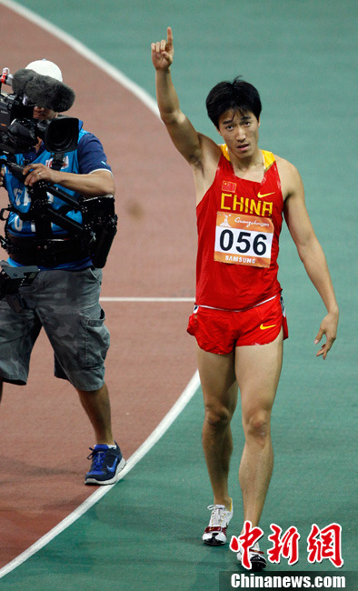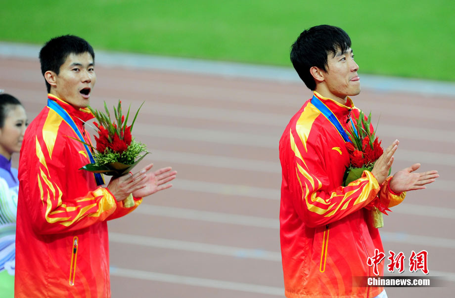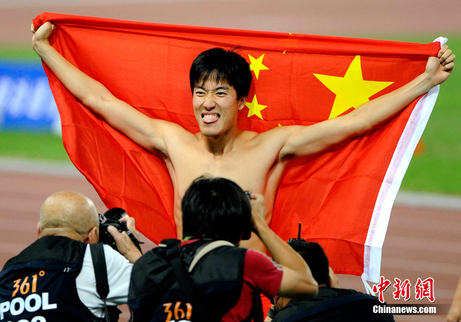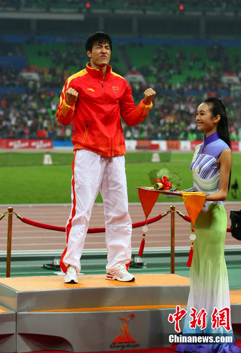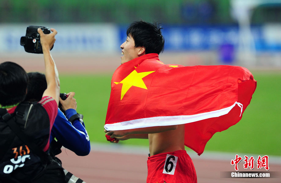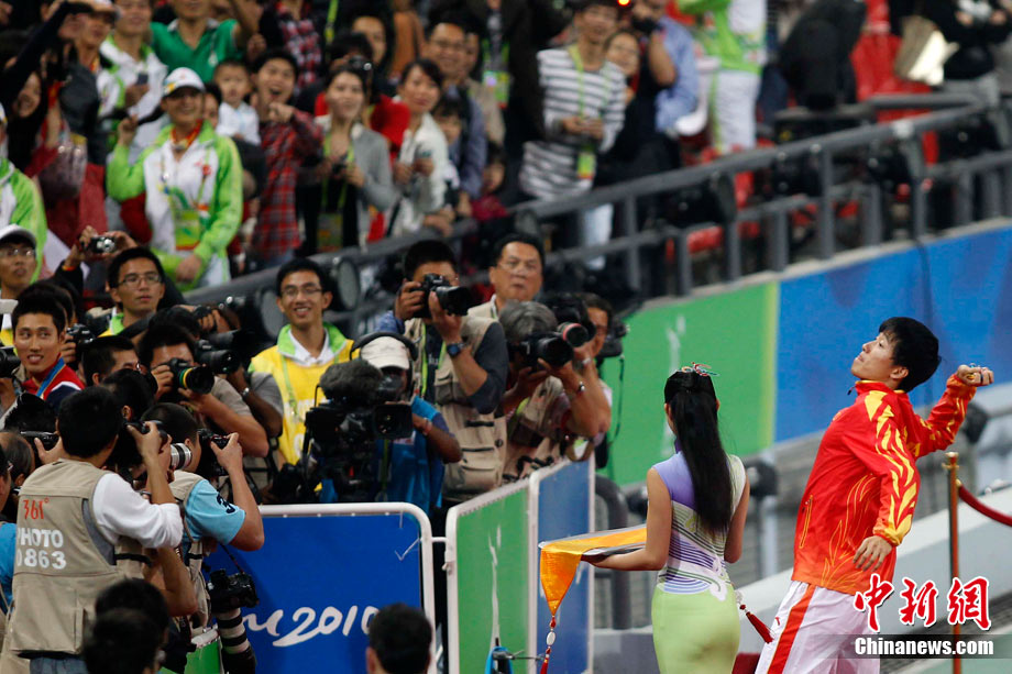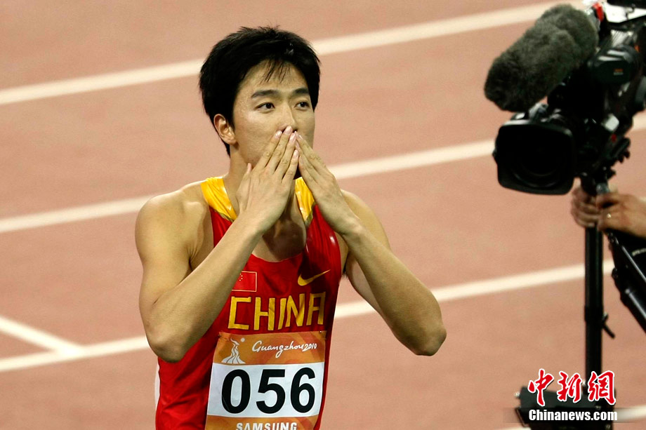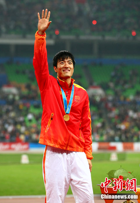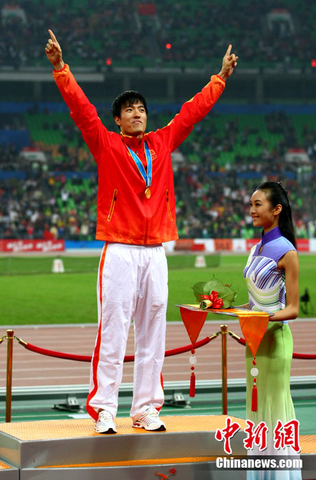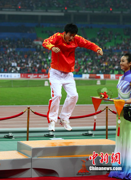 11月24日,廣州亞運會男子110米欄決賽,劉翔以13秒09的成績奪得金牌,這一成績打破了亞運會紀錄。劉翔以一場酣暢淋漓的勝利宣告了自己的回歸。圖為劉翔跳上領(lǐng)獎臺。中新社記者 富田 攝