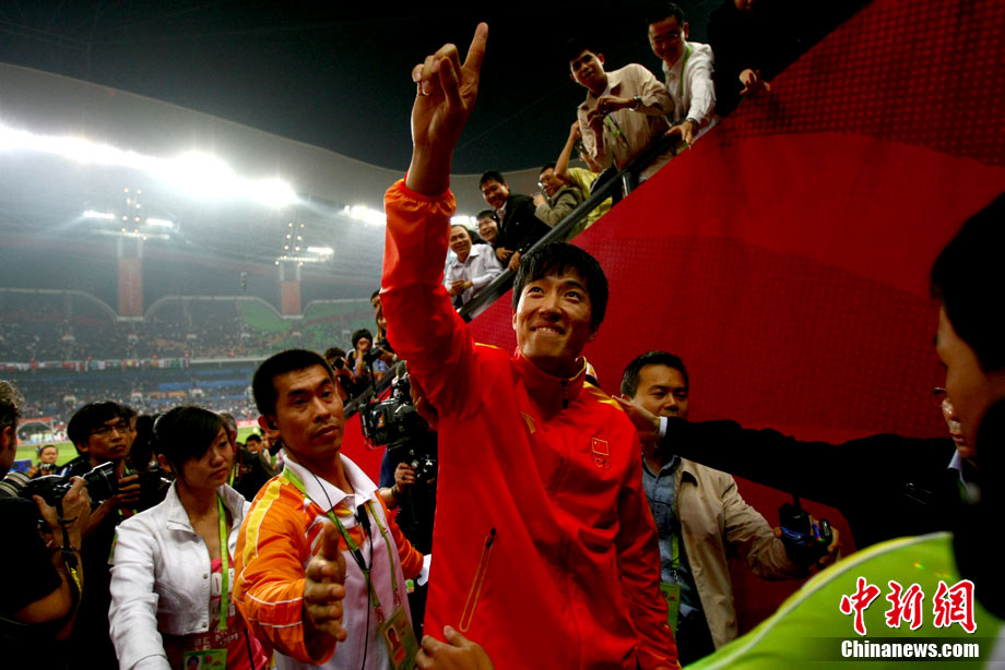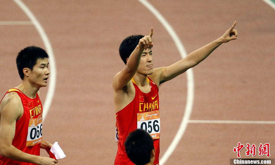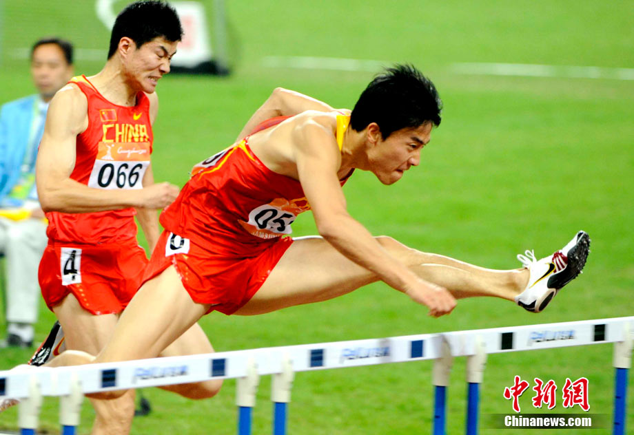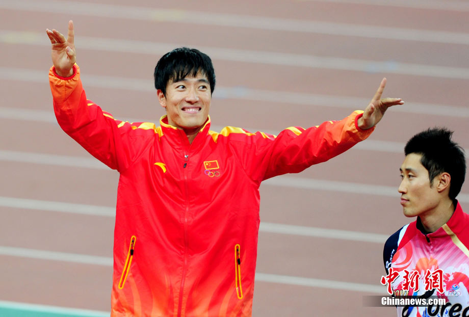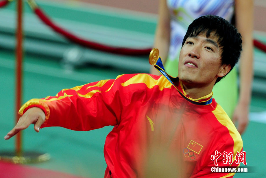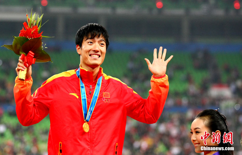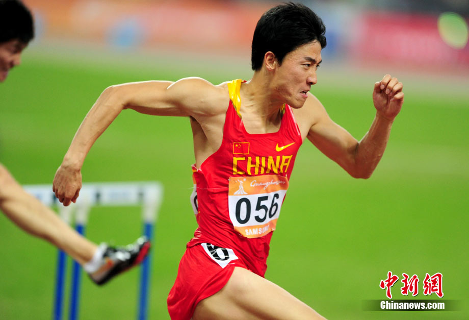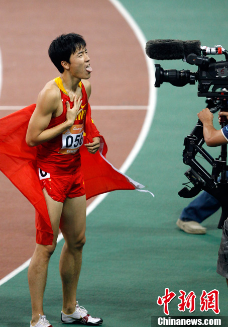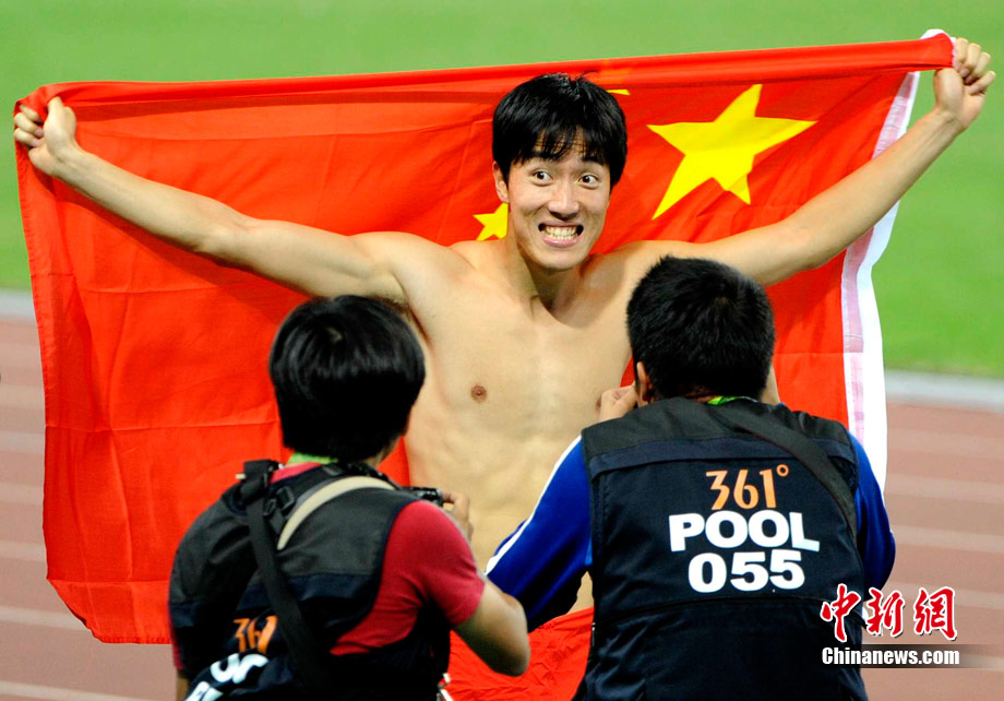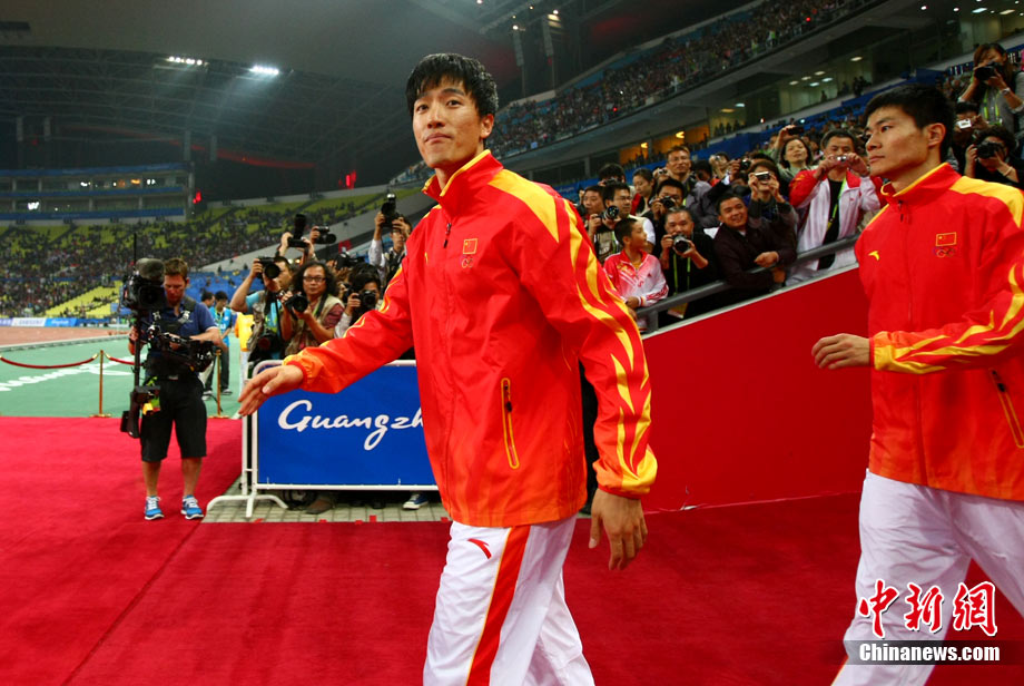 11月24日,廣州亞運會男子110米欄決賽,劉翔以13秒09的成績奪得金牌,這一成績打破了亞運會紀錄。劉翔以一場酣暢淋漓的勝利宣告了自己的回歸。圖為劉翔跳上領(lǐng)獎臺。中新社記者 富田 攝