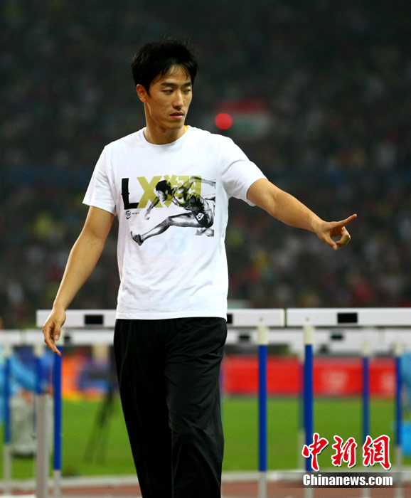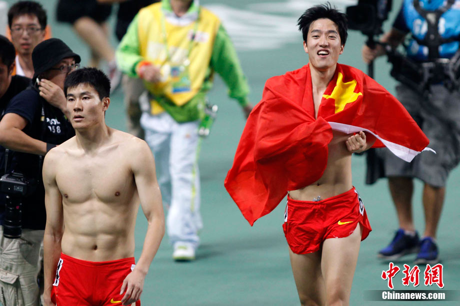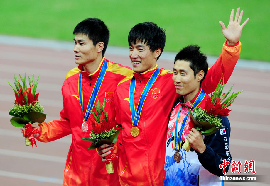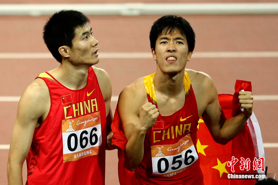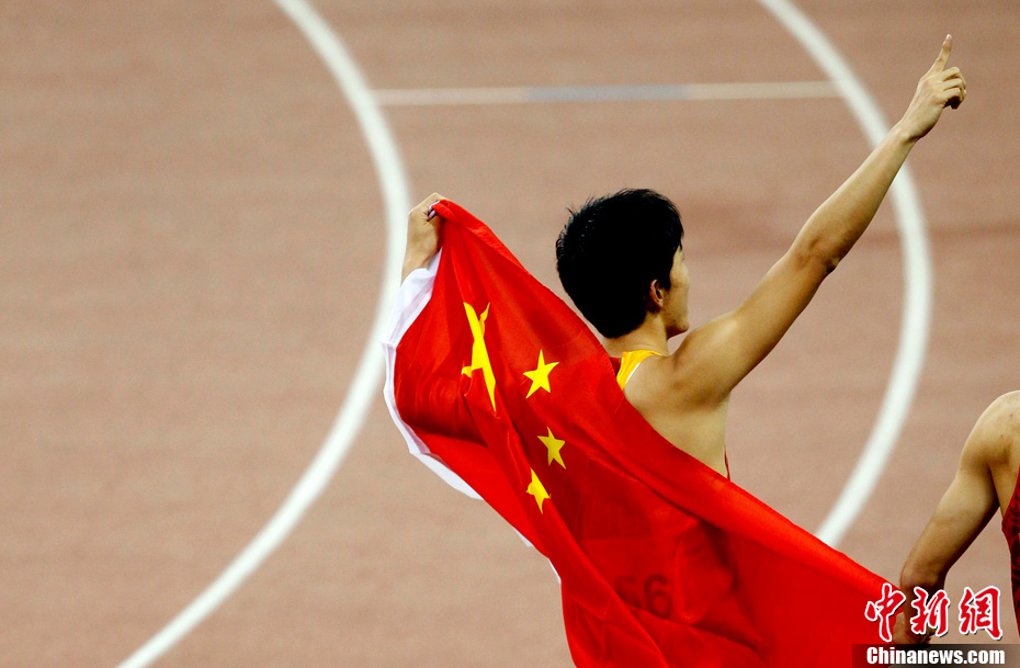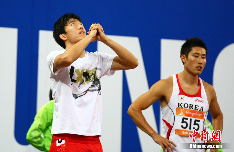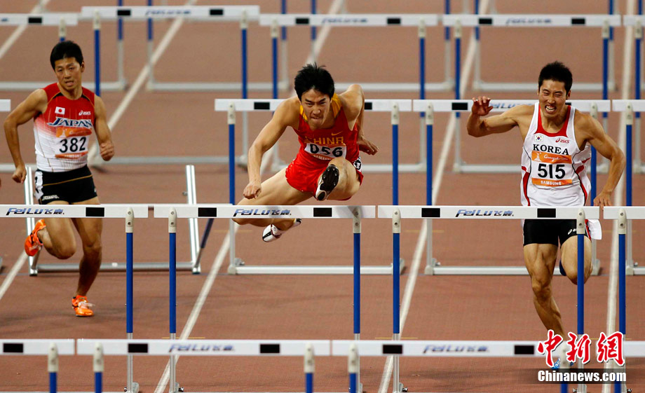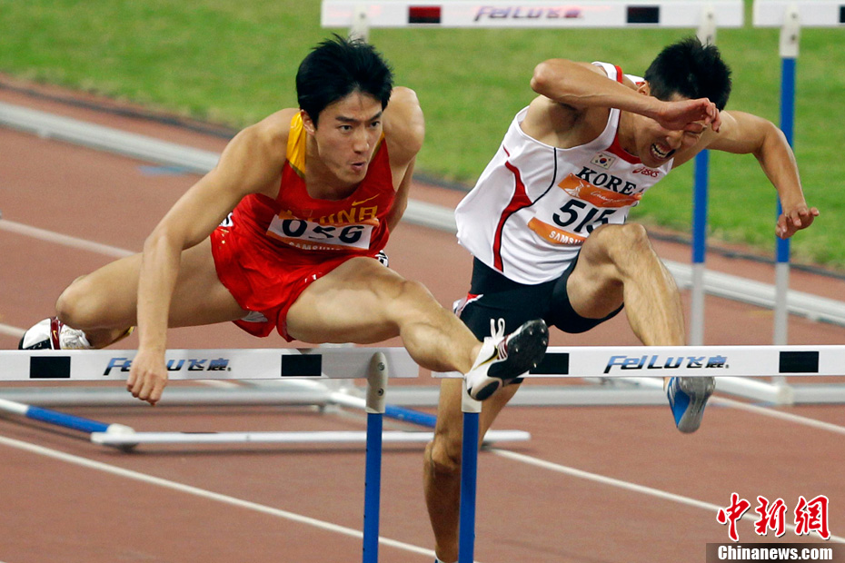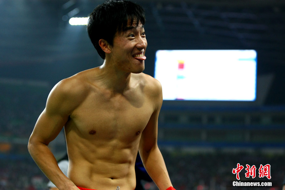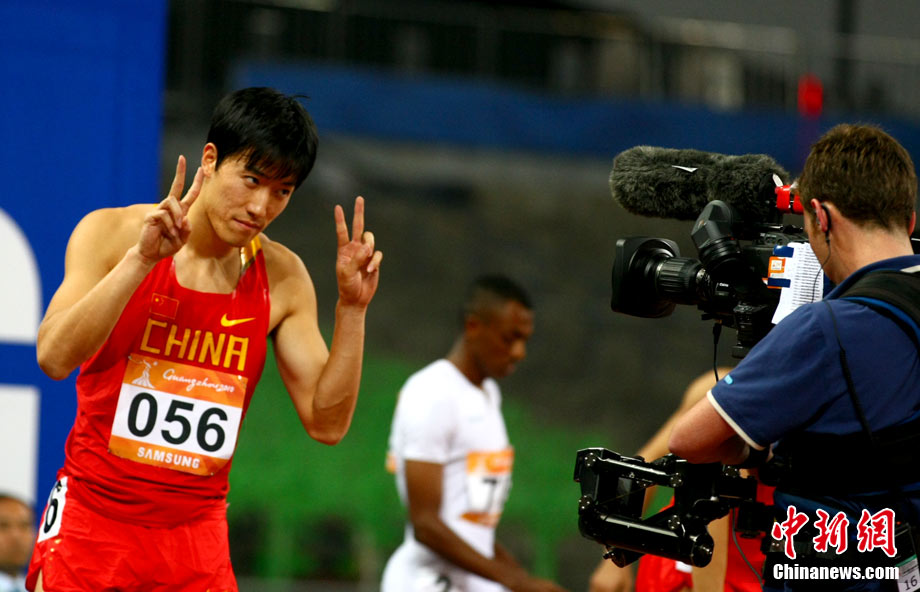 11月24日,廣州亞運會男子110米欄決賽,劉翔以13秒09的成績奪得金牌,這一成績打破了亞運會紀錄。劉翔以一場酣暢淋漓的勝利宣告了自己的回歸。圖為劉翔跳上領(lǐng)獎臺。中新社記者 富田 攝
