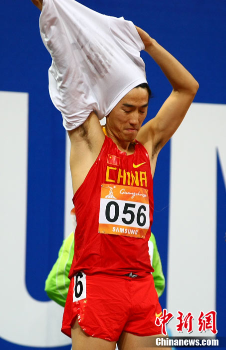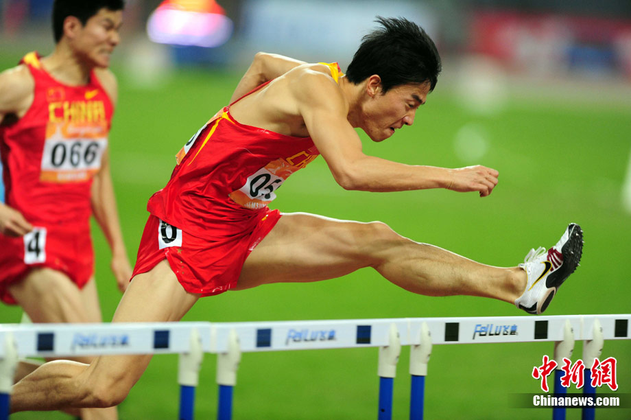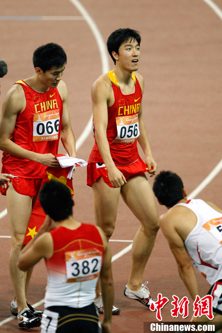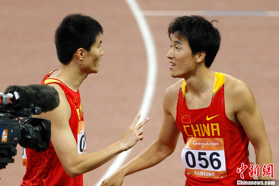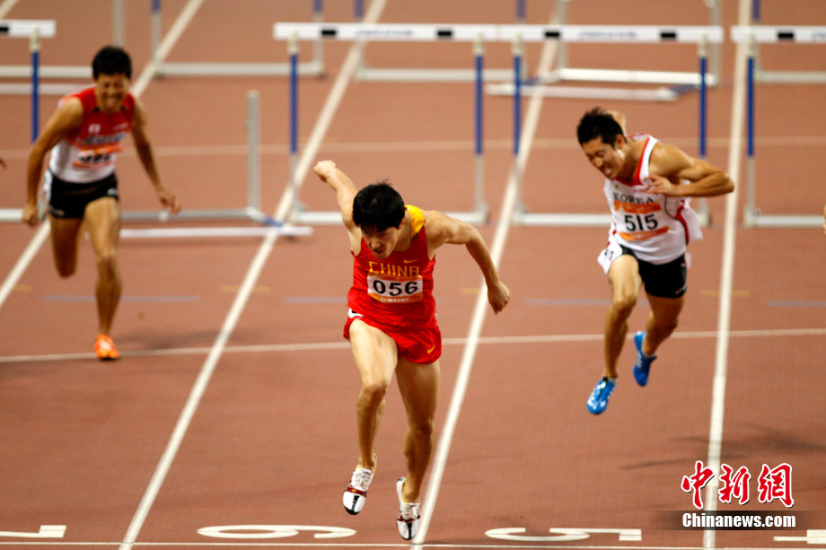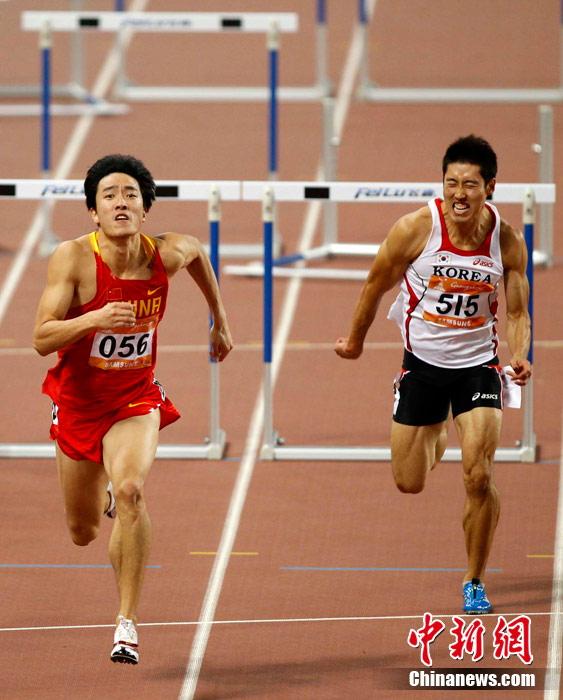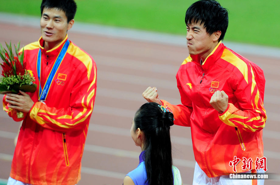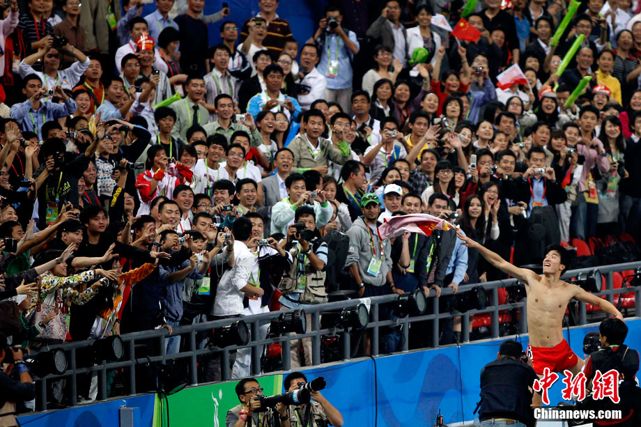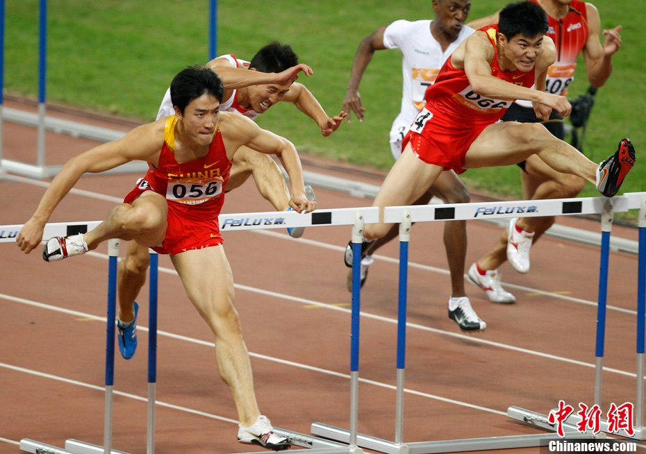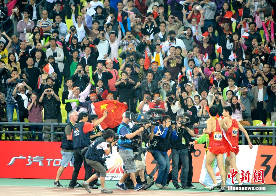 11月24日,廣州亞運會男子110米欄決賽,劉翔以13秒09的成績奪得金牌,這一成績打破了亞運會紀錄。劉翔以一場酣暢淋漓的勝利宣告了自己的回歸。圖為劉翔跳上領(lǐng)獎臺。中新社記者 富田 攝