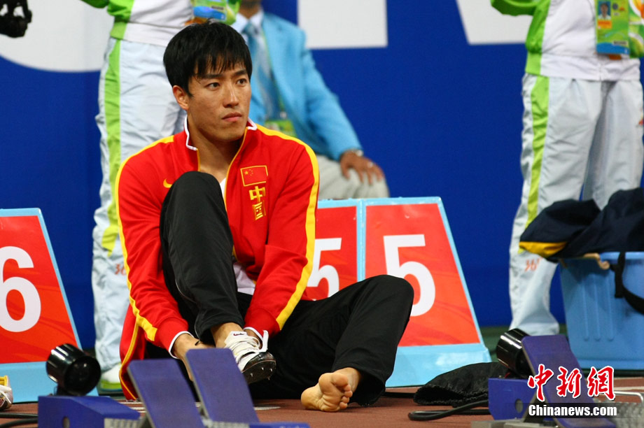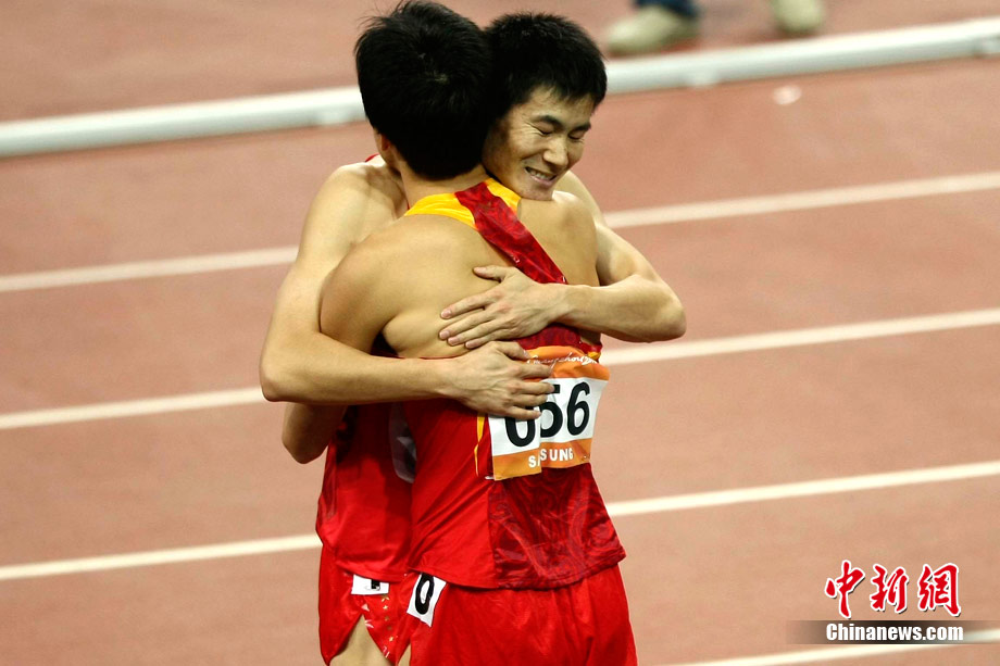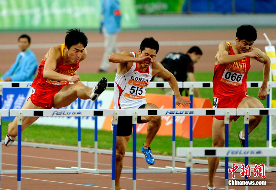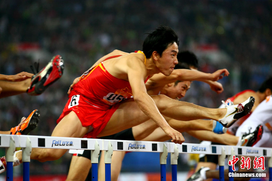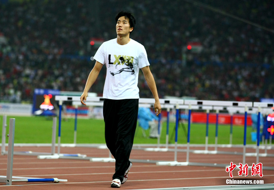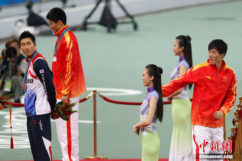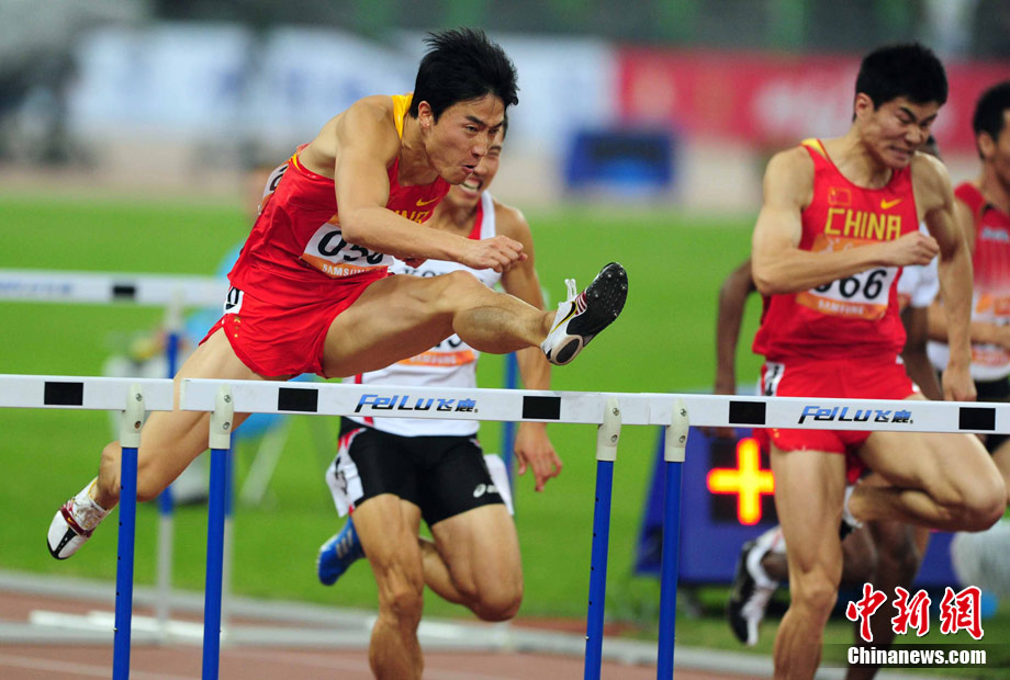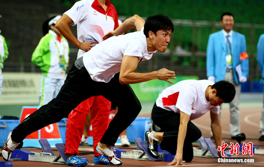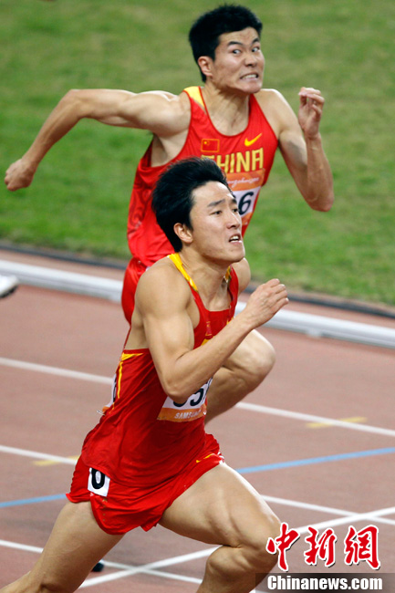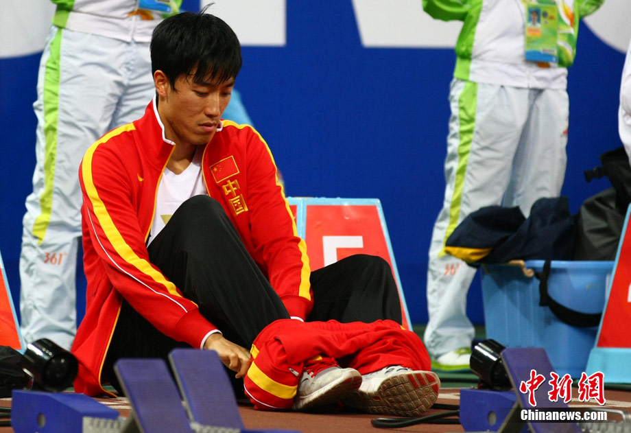 11月24日,廣州亞運會男子110米欄決賽,劉翔以13秒09的成績奪得金牌,這一成績打破了亞運會紀錄。劉翔以一場酣暢淋漓的勝利宣告了自己的回歸。圖為劉翔跳上領(lǐng)獎臺。中新社記者 富田 攝