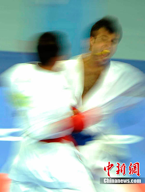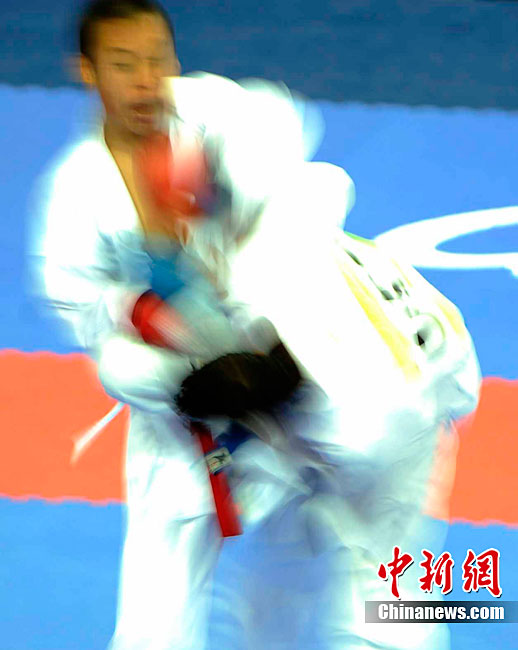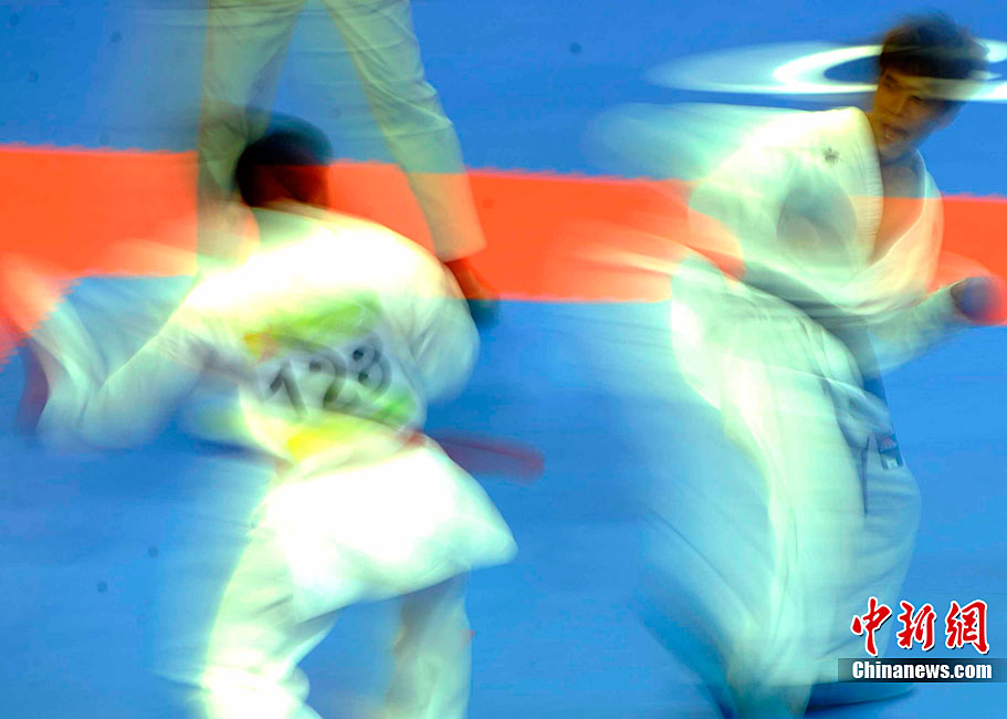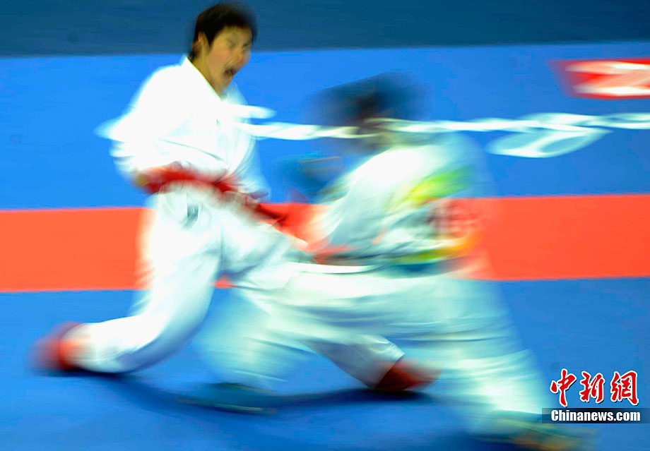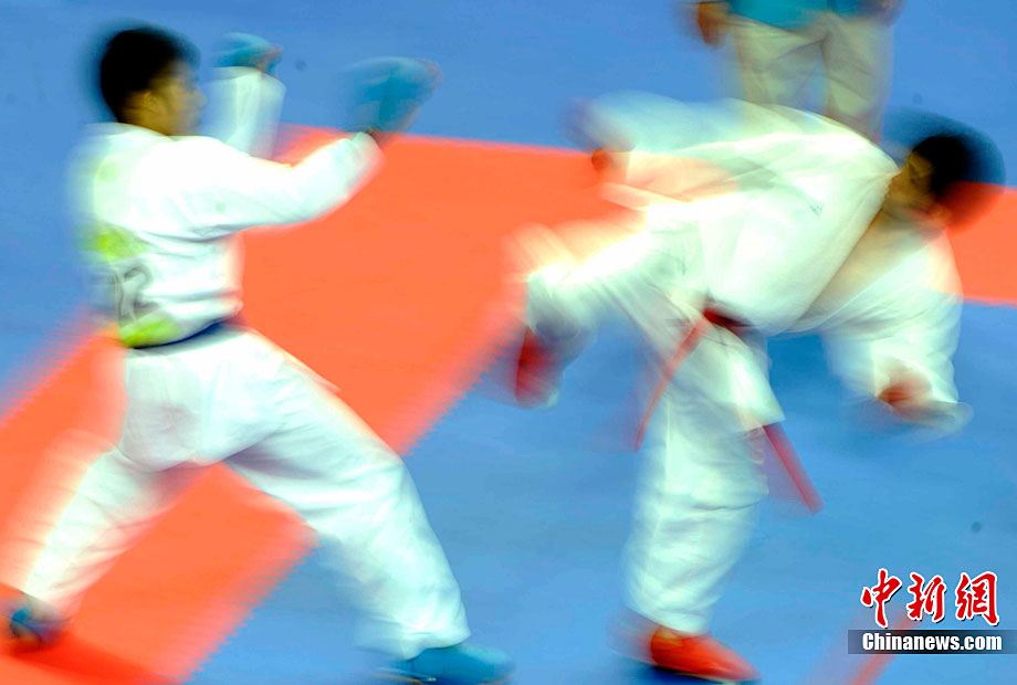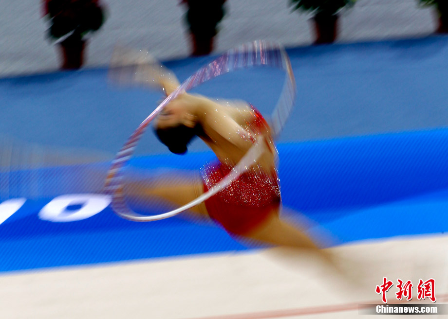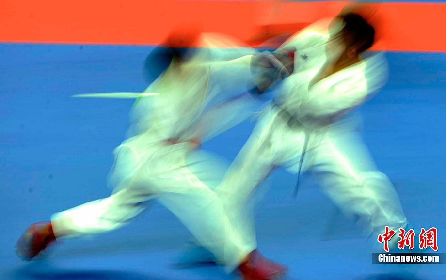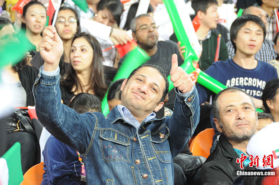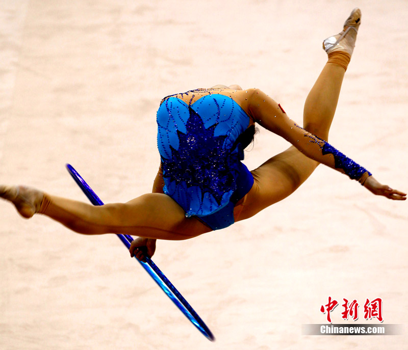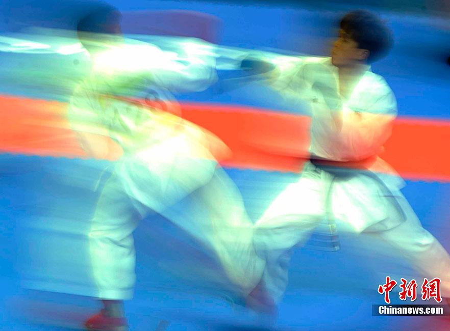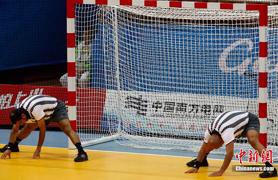 11月25日,亞運(yùn)手球館內(nèi),中國(guó)女子手球隊(duì)對(duì)陣哈薩克斯坦隊(duì)爭(zhēng)取決賽權(quán)。賽前,兩位主裁判在大門(mén)前進(jìn)行熱身且動(dòng)作統(tǒng)一協(xié)調(diào)。中新社記者 任海霞 攝