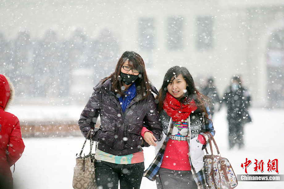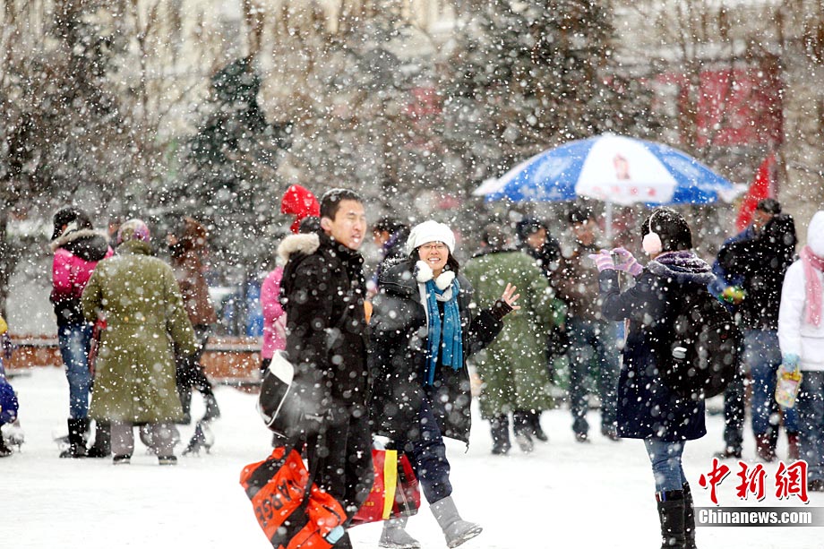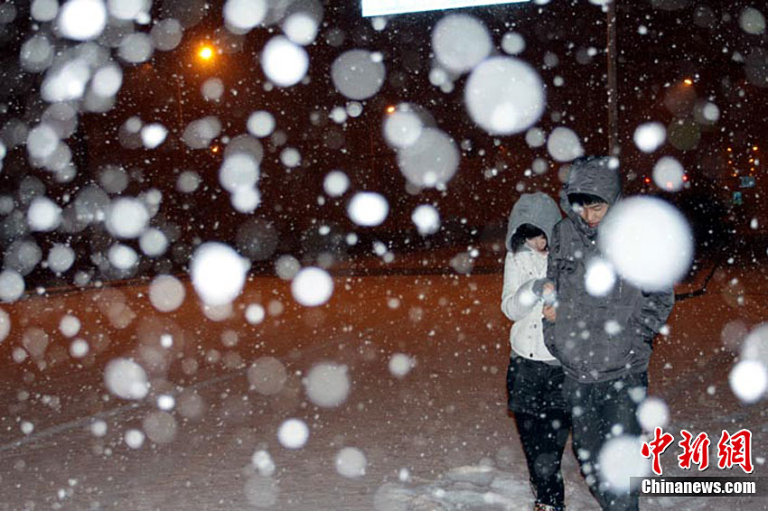 11月26日晚8時(shí)到27日早8時(shí),吉林省大部分地區(qū)出現(xiàn)急降雪天氣,其中臨江降雪量最大,達(dá)到9.9毫米,截至目前,蛟河積雪最深,達(dá)到14厘米。這場(chǎng)大雪導(dǎo)致長(zhǎng)春市龍嘉機(jī)場(chǎng)關(guān)閉近9個(gè)小時(shí),到27日7時(shí)才開放,目前吉林省多條高速部分路段仍在臨時(shí)封閉中。圖為26日夜,一對(duì)情侶在大雪中行走。田偉 攝