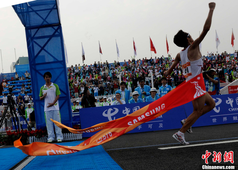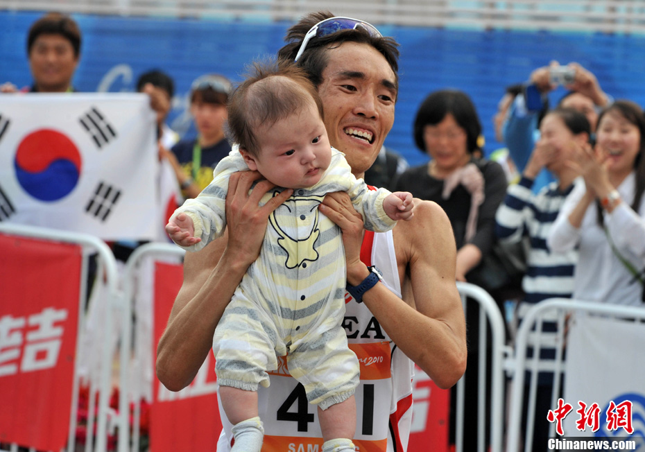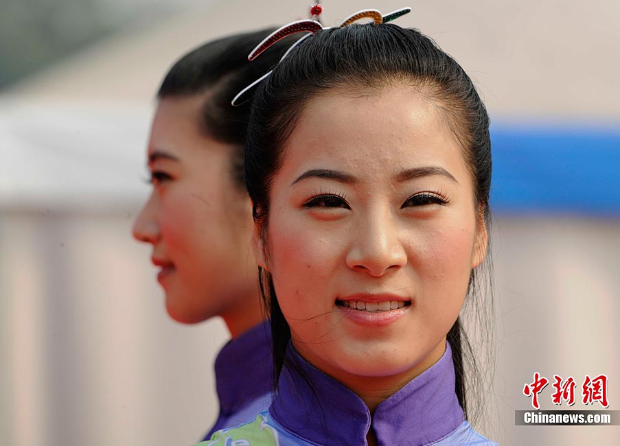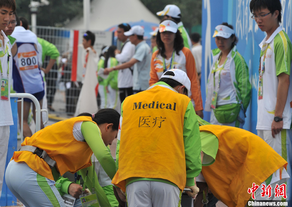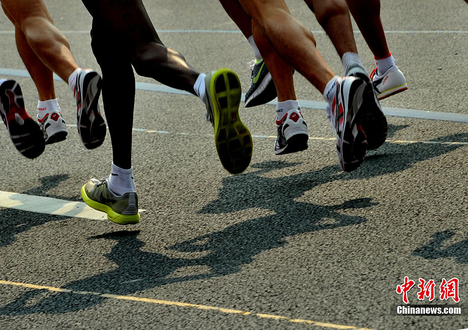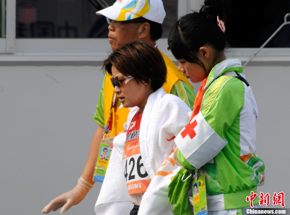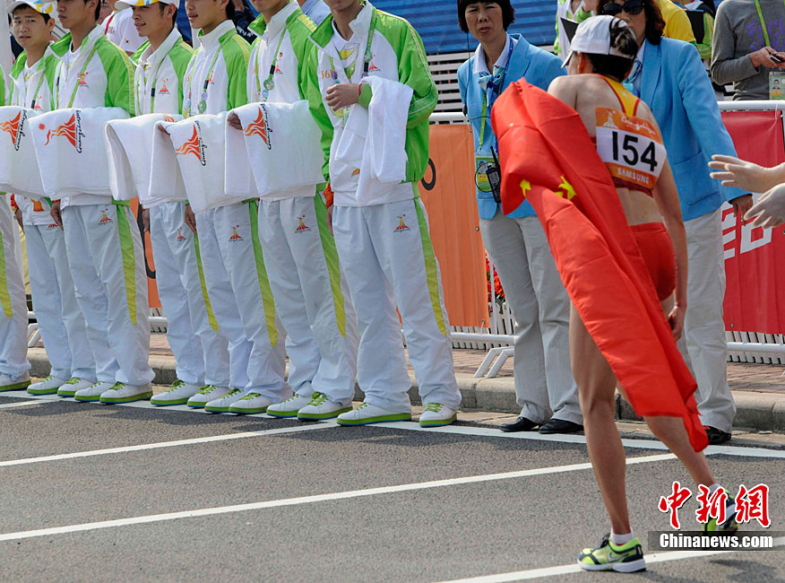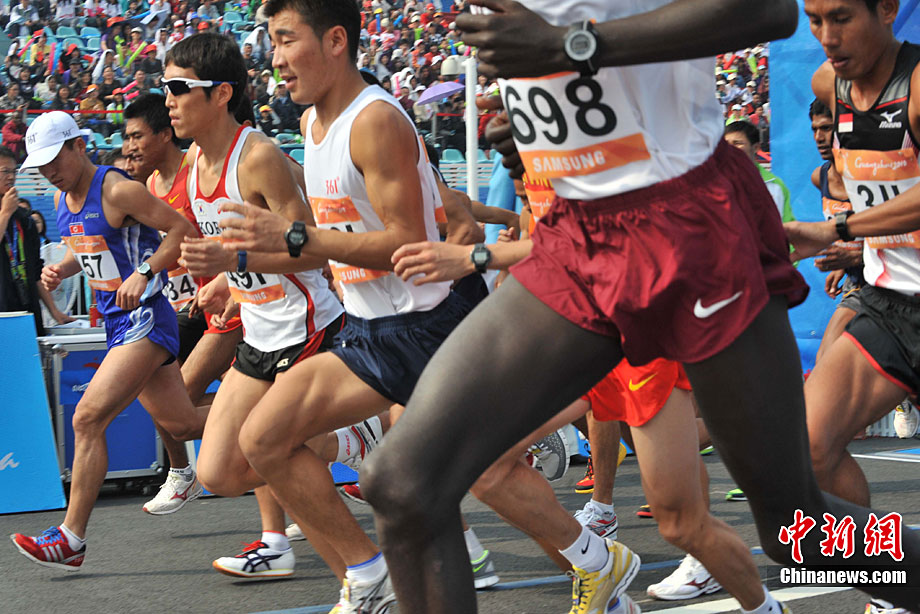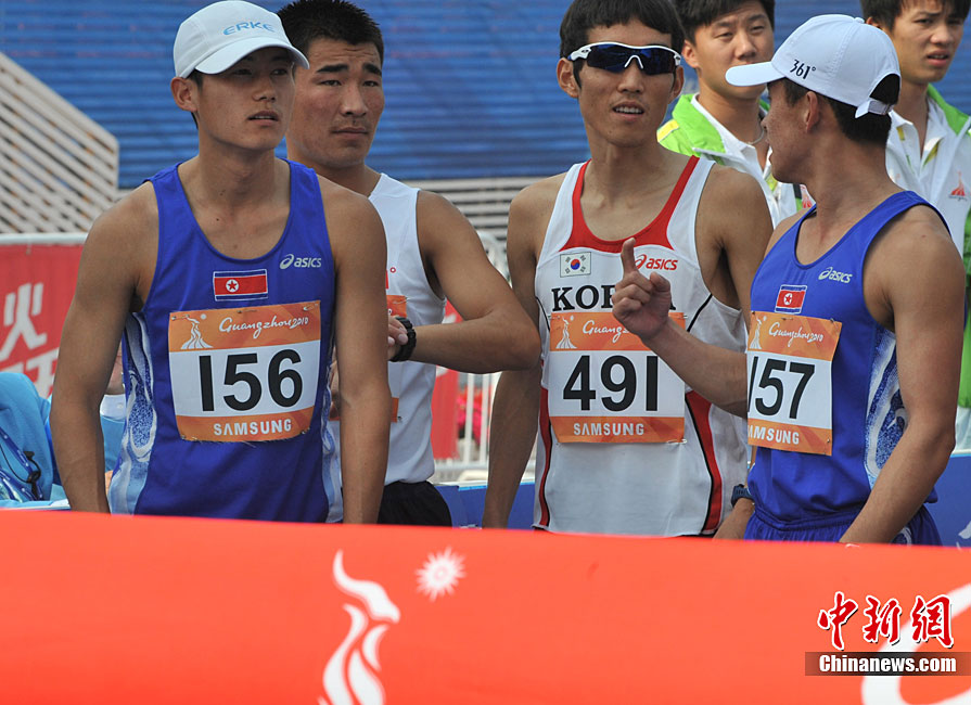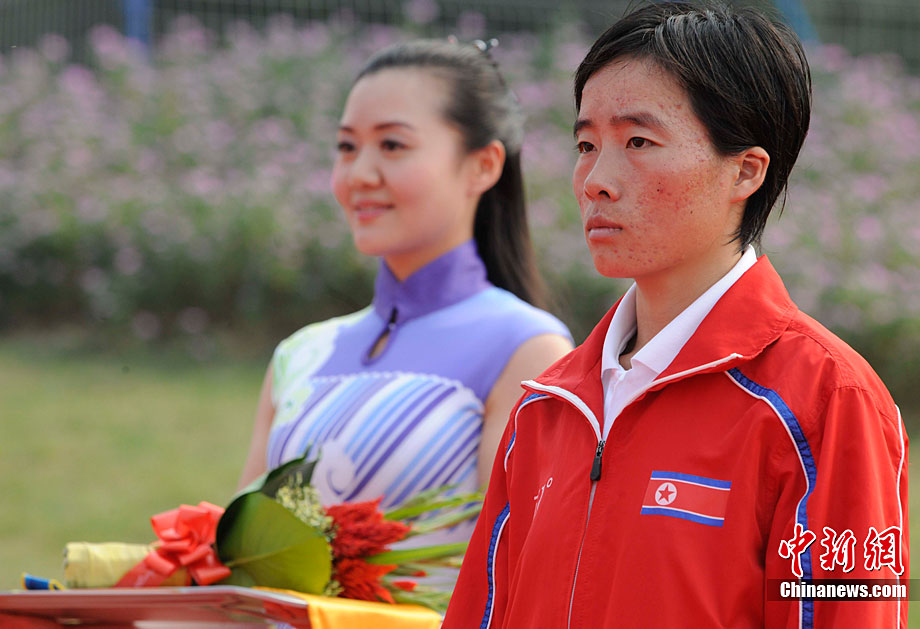 11月27日清晨,女子飛毛腿們聚集廣州亞運會最后一天的馬拉松賽場,朝鮮名將全京姬(左一)和韓國名將淋敬熙(右一)站在同一起跑線上準(zhǔn)備一較高下。中新社記者 賈國榮 攝