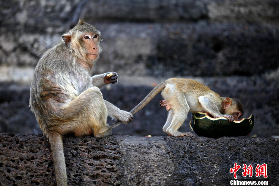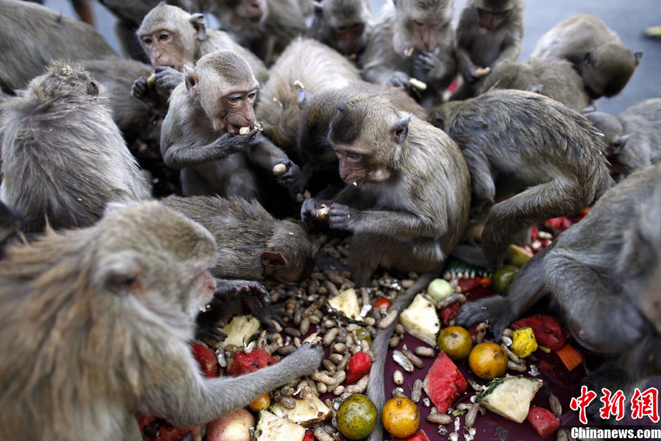 11月28日,泰國華富里,一年一度的“猴子的宴會”活動在當(dāng)?shù)嘏e行。猴子們可以盡情享用超過4000公斤的水果和蔬菜。華富里以猴子眾多聞名,猴子們每年都為當(dāng)?shù)匚齺泶罅坑^光客。