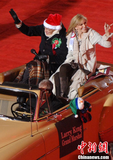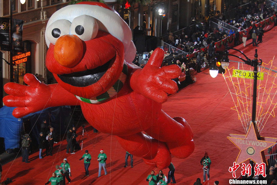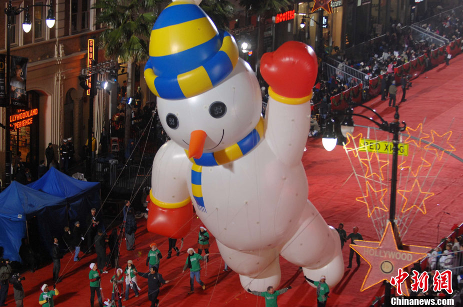 11月28日晚,一年一度的好萊塢迎圣誕大游行在好萊塢大道隆重舉行。CNN王牌主播拉里·金擔任今年游行的大禮官,在他的率領下,近60名好萊塢明星和14個樂隊、8個騎馬方陣、巨型充氣卡通、花車等游行隊伍依次通過紅地毯,為洛杉磯迎圣誕活動拉開大幕。好萊塢迎圣誕大游行始于1928年,至今已有80多年歷史。中新社發(fā) 張煒 攝