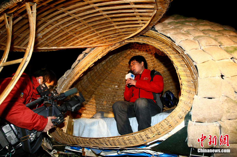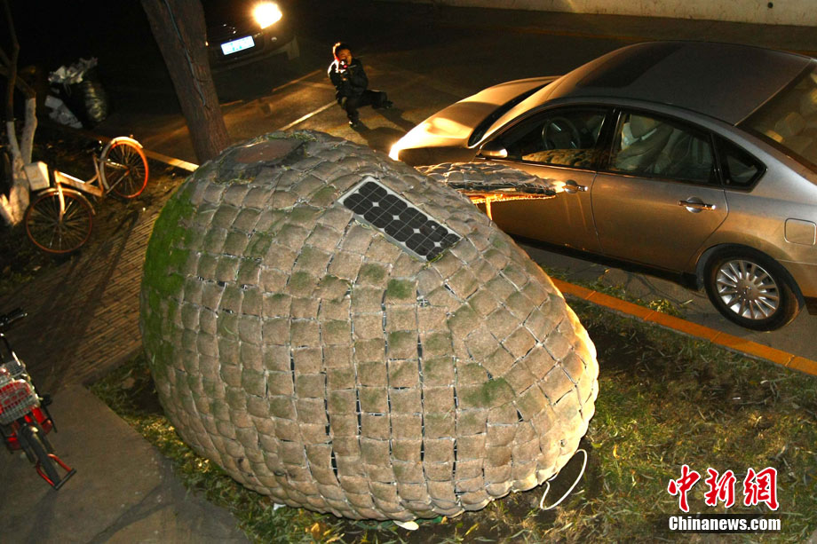 近日,來自湖南的24歲青年戴海飛在北京市海淀區(qū)成府路的一個(gè)大院里,搭起一個(gè)“蛋形”小屋,作為自己的蝸居。小屋兩米多高,“蛋殼”上有一個(gè)橢圓形的小門,沒有鎖。小屋的下邊裝有輪子,可以挪動(dòng)。小屋引起了多家媒體的高度關(guān)注,2日深夜有大批的記者來到小屋采訪,而戴海飛卻不知因何一直沒有露面,直到深夜11點(diǎn)多,也沒有回到小屋。中新社記者 富田 攝