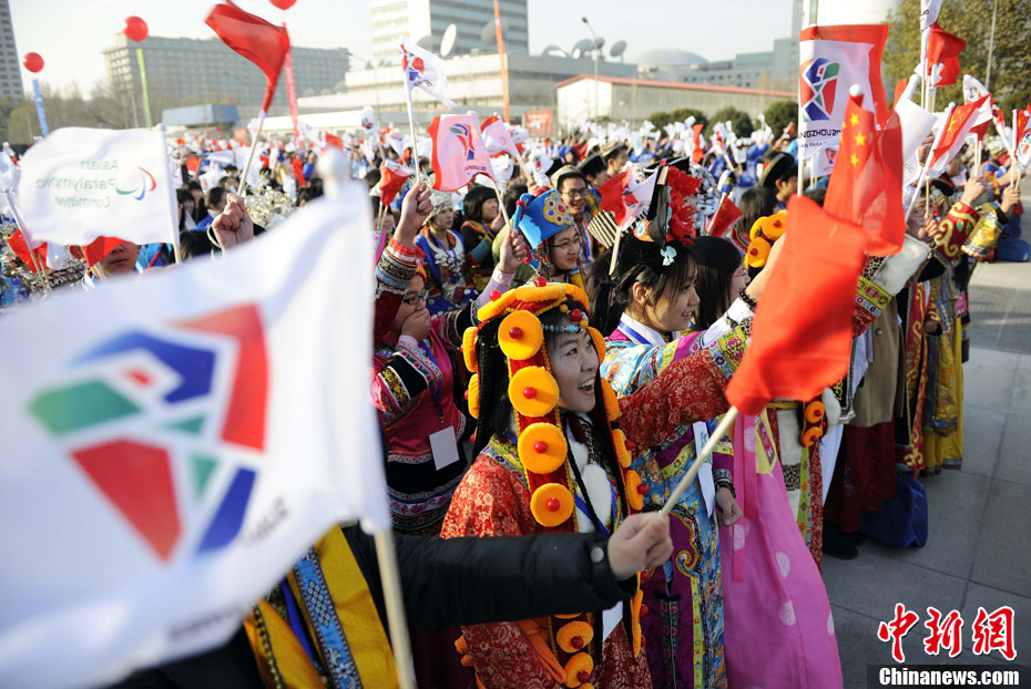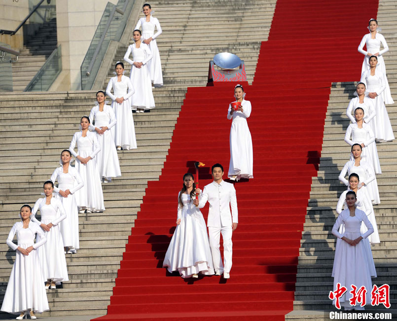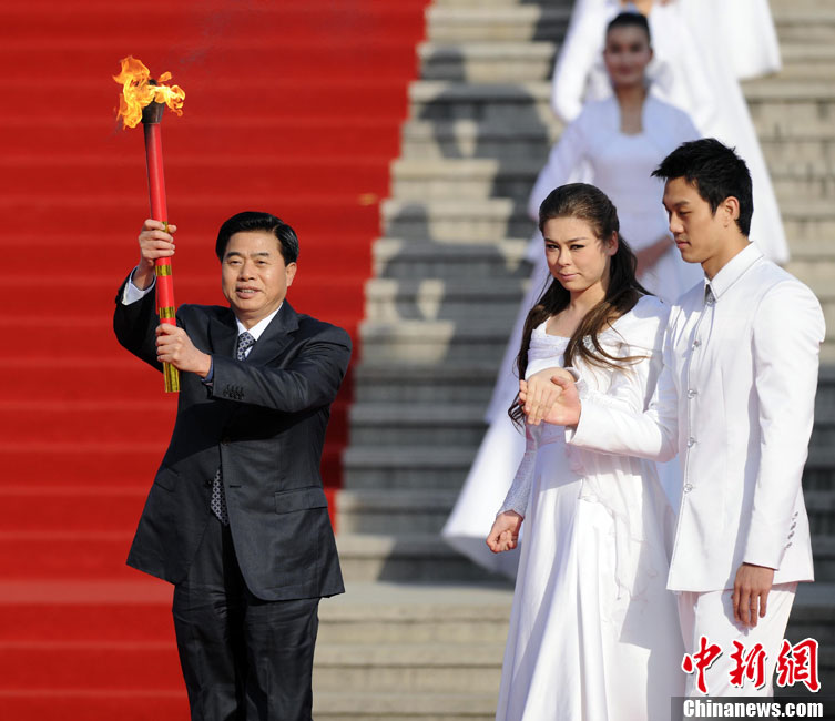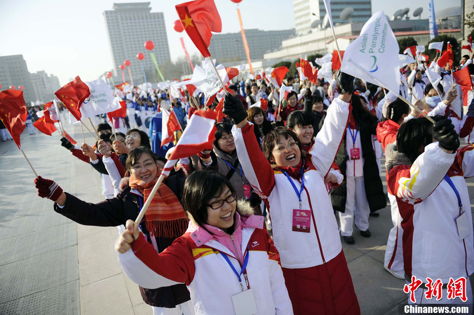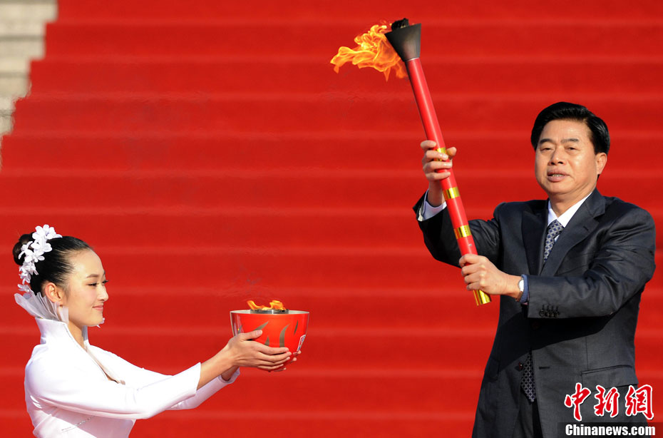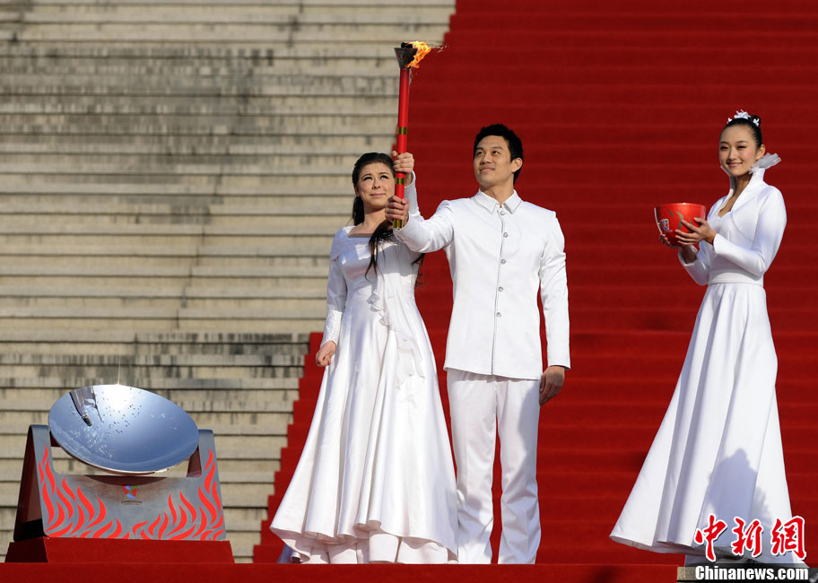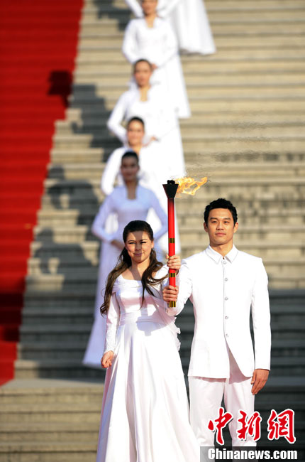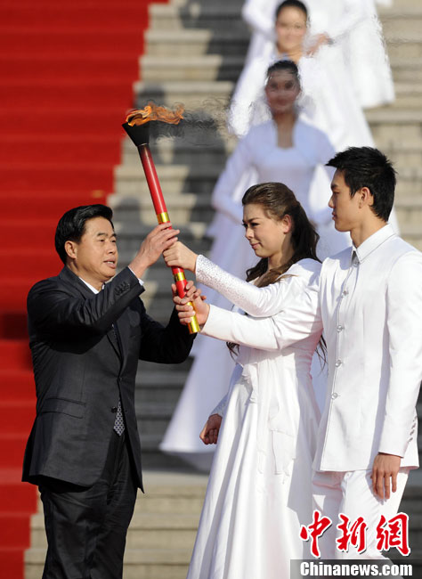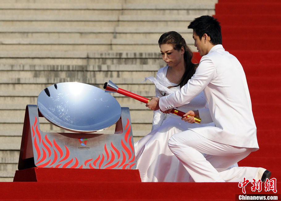 12月3日,采火使者阿迪蘭(左)和周嘉威成功采集亞殘運會火種。當日,廣州2010年亞洲殘疾人運動會火種采集儀式在北京中華世紀壇舉行。兩名采火使者分別是來自新疆特殊教育職業(yè)中學的學生阿迪蘭和廣州亞運會三枚金牌得主游泳名將周嘉威。中新社記者 劉震 攝