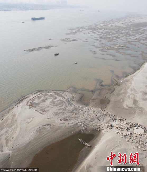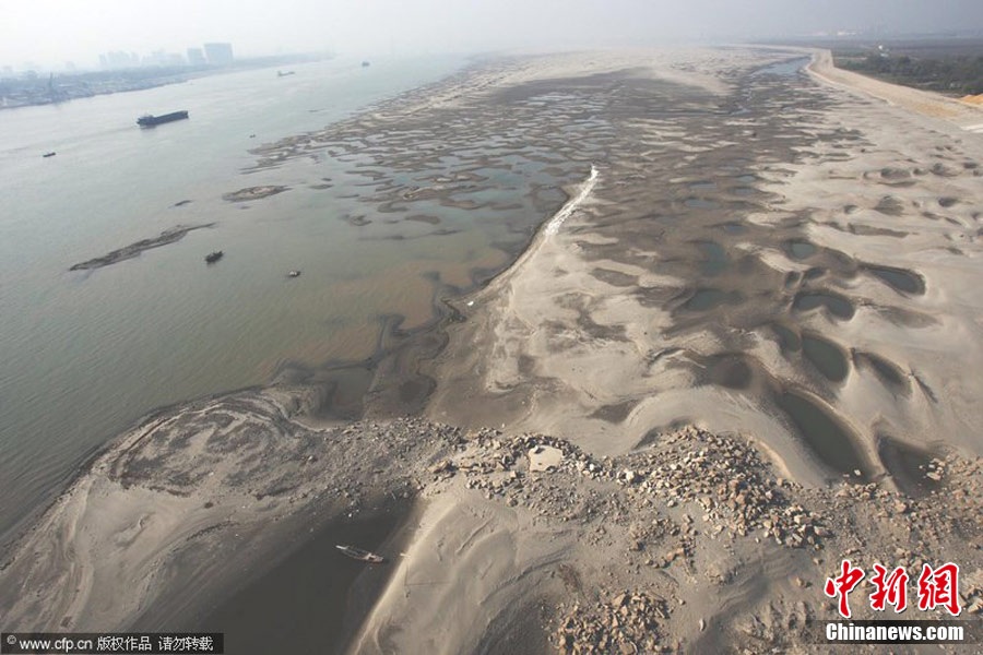 12月7日,在長江武漢市天興洲水域,大量沙洲露出江面,形成大大小小的沙丘,分布在水岸。據(jù)悉,近期,由于長江中下游地區(qū)持續(xù)多日的干燥少雨的天氣,長江漢口水位接近枯水期的標(biāo)植。金思柳 攝 圖片來源:CFP視覺中國