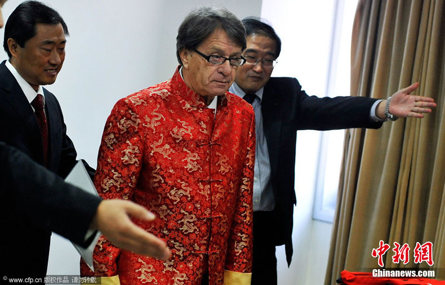 12月11日,中國北京,中國足協(xié)召開新聞發(fā)布會,前上海申花主帥布拉澤維奇正式出任國奧主帥。圖為布拉澤維奇著唐裝出席發(fā)布會。圖片來源:CFP視覺中國