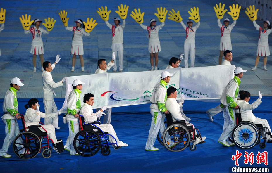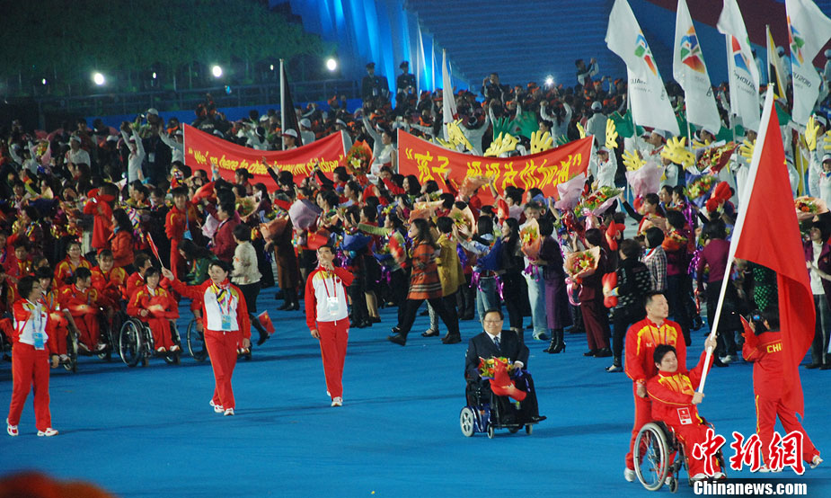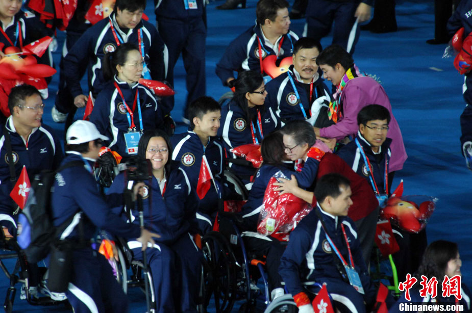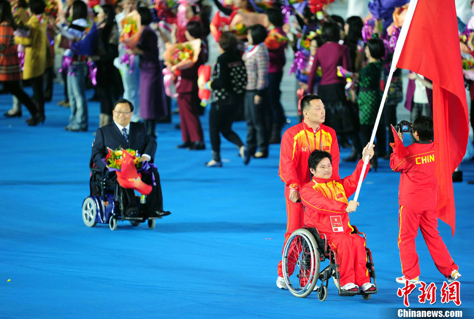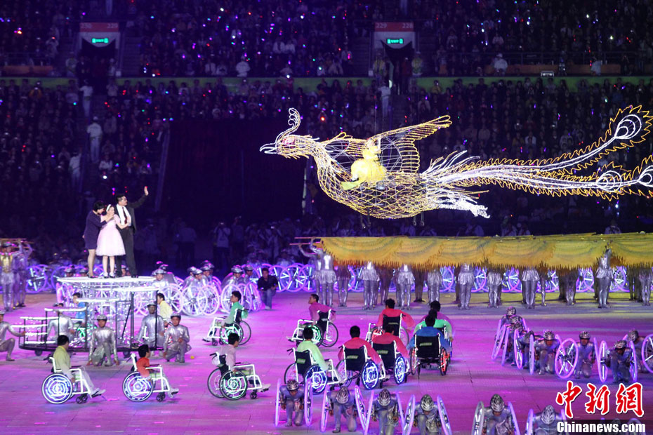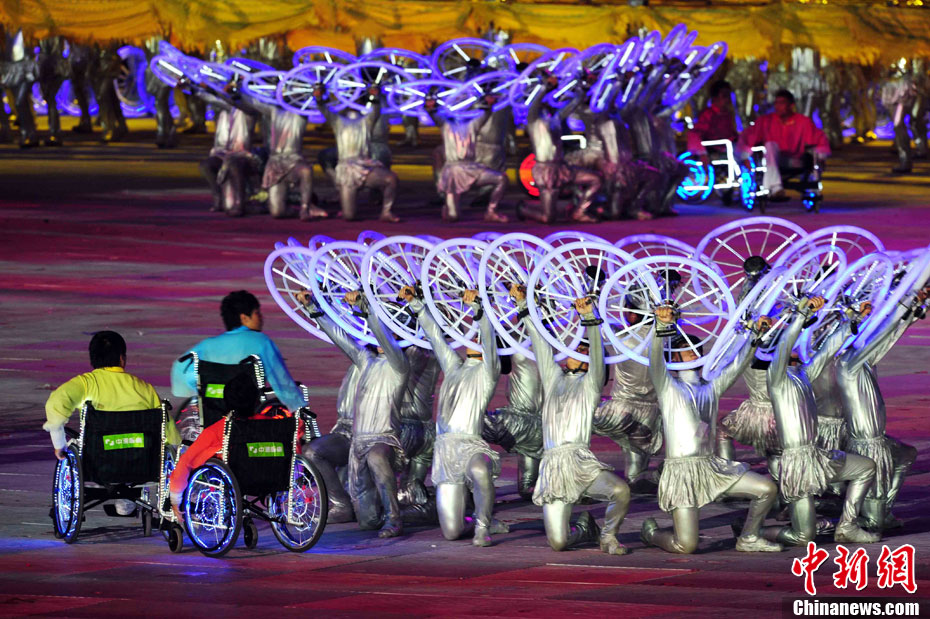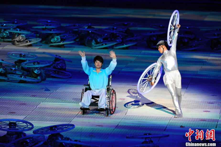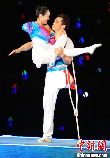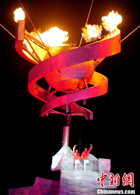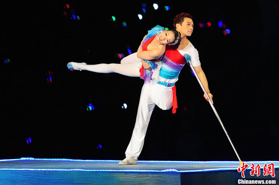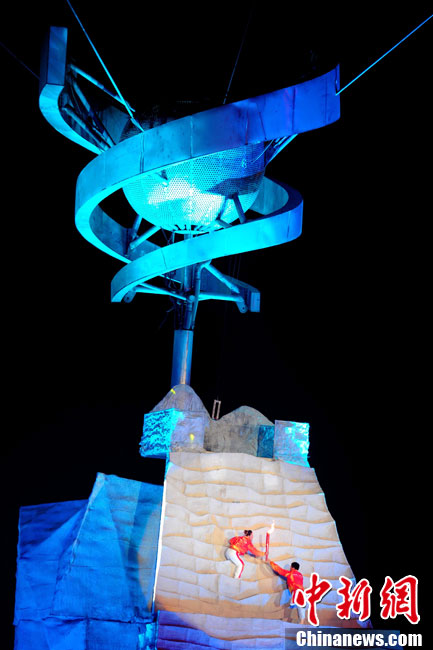 廣州2010年亞殘運會12月12日晚在廣州盛大開幕,開幕式晚會以“大愛、動人、自強不息”為主題,圖為開幕式現(xiàn)場火炬?zhèn)鬟f第七棒火炬手中國五四青年獎章獲得者張立新與第八棒火炬手殘奧會中國代表團優(yōu)秀運動員張海原相互攜助,一級級攀登上主火炬臺。中新社發(fā) 張美安 攝