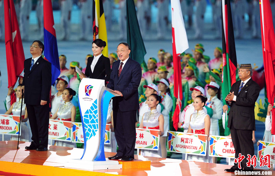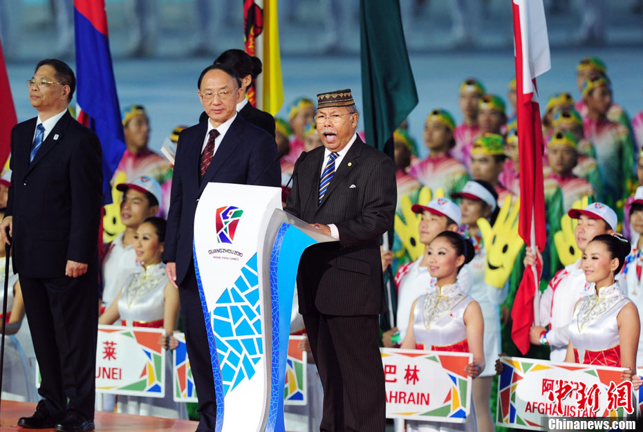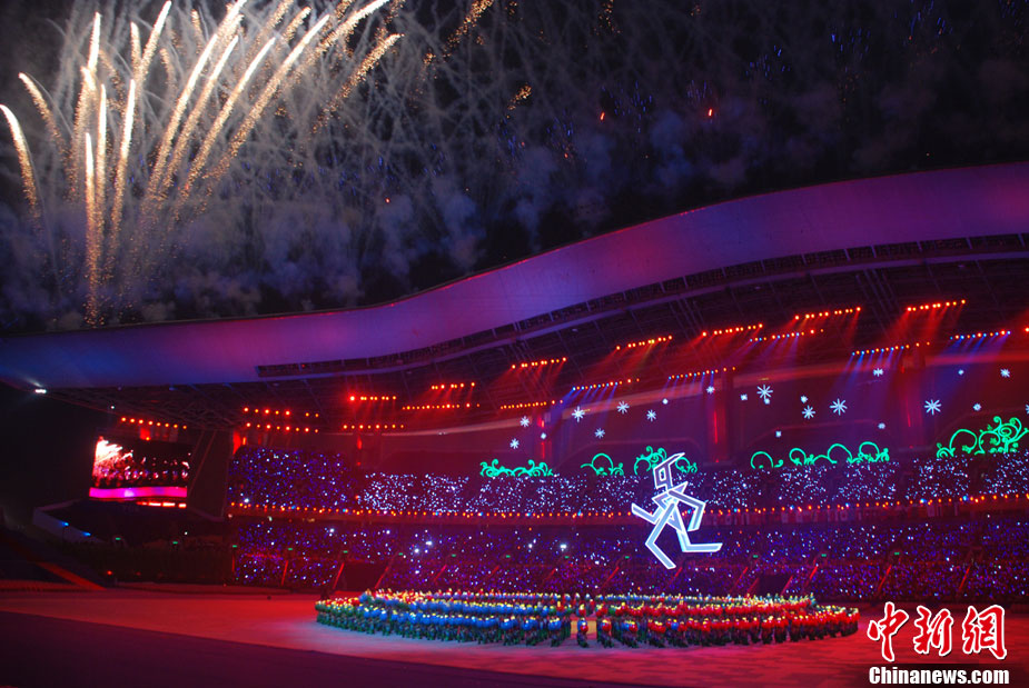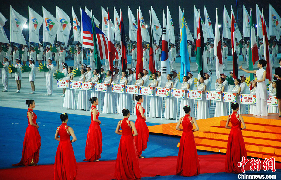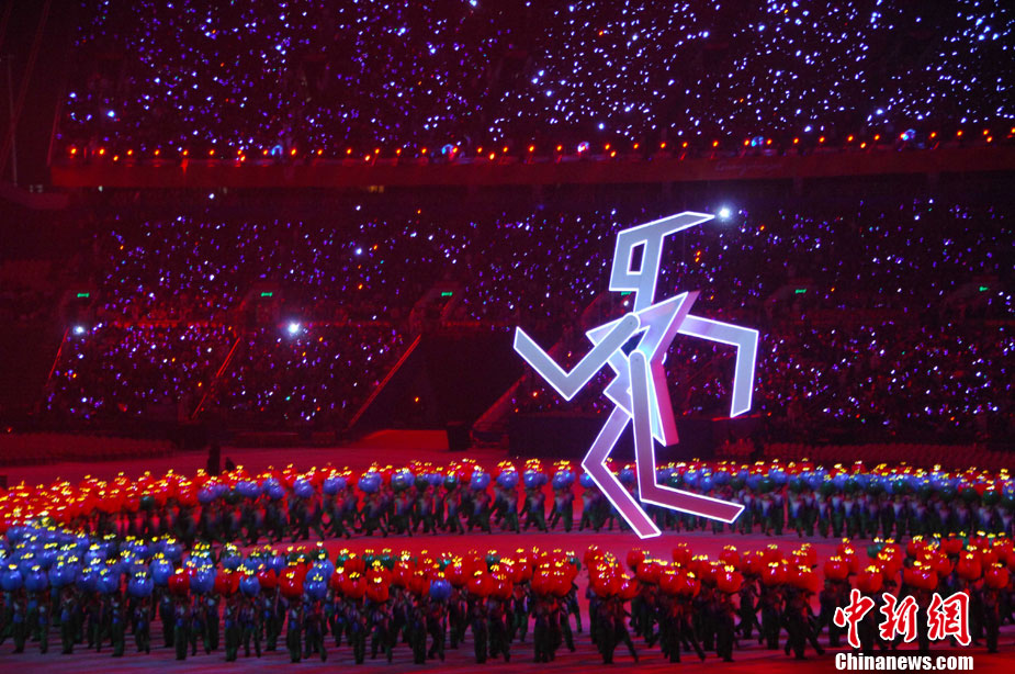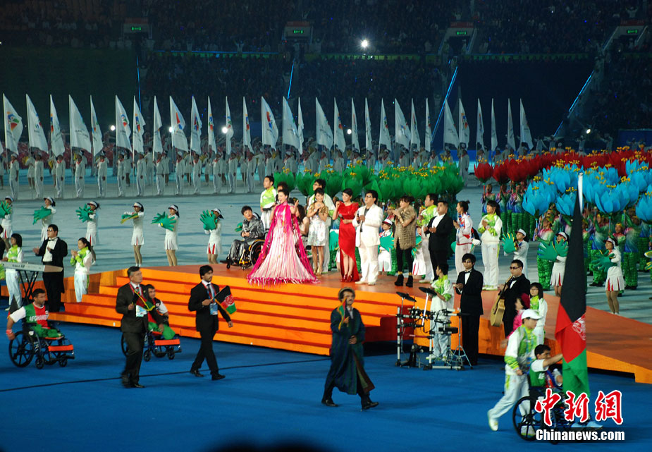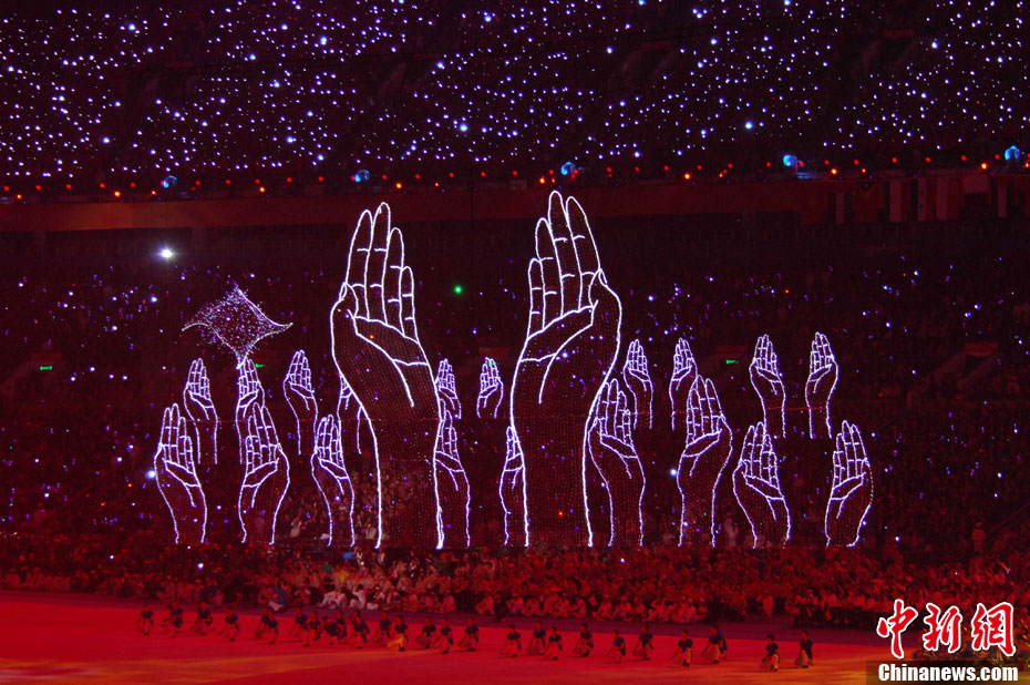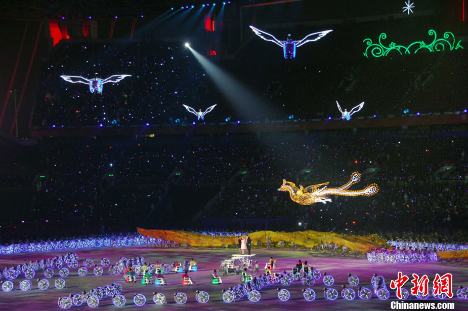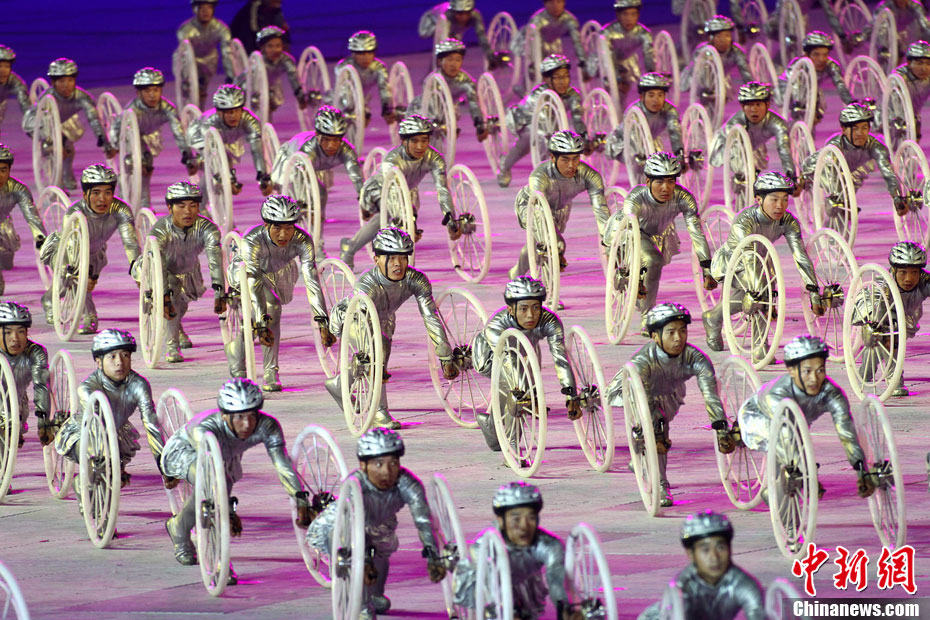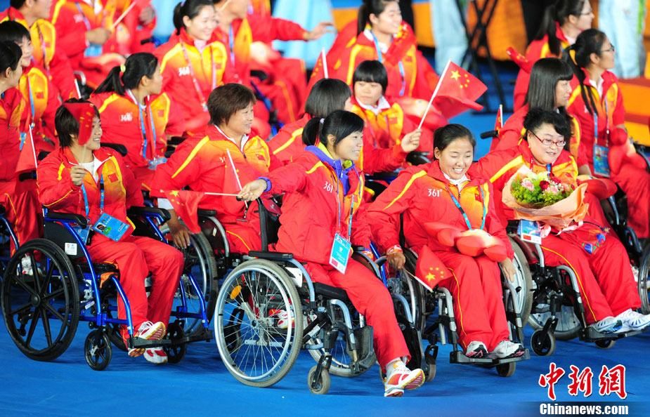 廣州2010年亞殘運會12月12日晚在廣州盛大開幕,開幕式晚會以“大愛、動人、自強不息”為主題,圖為開幕式現(xiàn)場火炬?zhèn)鬟f第七棒火炬手中國五四青年獎章獲得者張立新與第八棒火炬手殘奧會中國代表團優(yōu)秀運動員張海原相互攜助,一級級攀登上主火炬臺。中新社發(fā) 張美安 攝