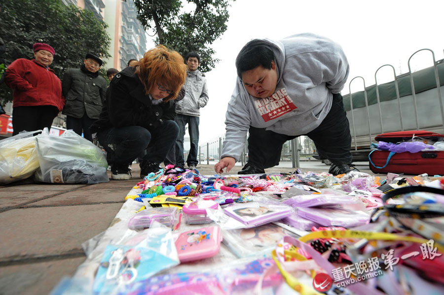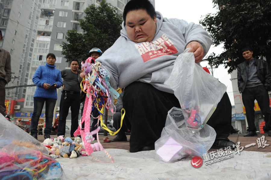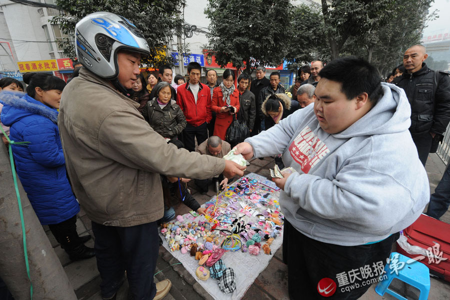 “走,出去擺哈地攤,活動一下!”吃過午飯后,梁用打開病房的衣柜,提出一大包鑰匙鏈、手機鏈、耳環(huán)、頭花等小飾品。梁用的出現(xiàn),猶如明星一般,“看,又是哪個胖娃!”不少人圍了過來。記者守候了半個多小時,發(fā)現(xiàn)大多顧客并非沖著飾品而來,而是被梁用巨大的體型吸引來的。