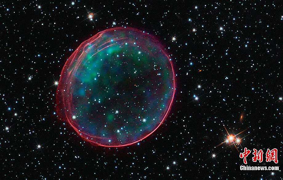近日,美國哈勃太空望遠鏡拍攝到了美麗的星系間“圣誕大氣泡”的照片。這個“圣誕大氣泡”是由400年前發(fā)生的超新星爆炸的殘骸形成的,它像一個精致的“殼”一樣漂浮在太空中。據(jù)悉,這個“圣誕大氣泡”是我們的臨近星系——大麥哲倫星云(Large Magellanic Cloud)中的一顆超新星在爆炸時發(fā)出的沖擊波及其噴射出來的物質(zhì) ,大麥哲倫星云與地球的距離為16萬光年?茖W(xué)家們將這個“圣誕大氣泡”氣圈命名為“SNR B0509-67.5”或者縮寫成“SNR 0509”。據(jù)悉,這個如氣泡狀的氣圈的直徑為23光年,并且正在以超過1100萬千米每小時的速度擴散。另外,哈勃太空望遠鏡拍攝到了“圣誕大氣泡”處于各種不同情況下的照片。