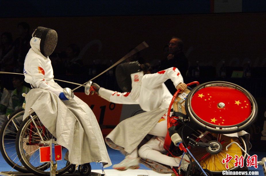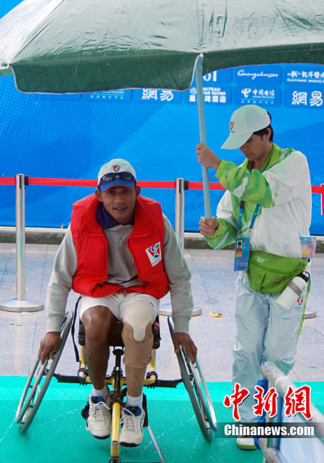 12月15日,志愿者雨天為運(yùn)動(dòng)員撐傘護(hù)航,無(wú)微不至。廣州2010亞殘運(yùn)會(huì),輪椅網(wǎng)球比賽在廣州天河體育中心網(wǎng)球?qū)W校舉行,因雨比賽從室外轉(zhuǎn)向室內(nèi)。尹雪峰 攝