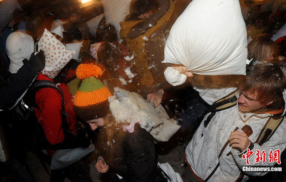 12月16日,人們?cè)诮菘瞬祭竦睦铣菑V場(chǎng)上參加為時(shí)三分鐘的枕頭大戰(zhàn)。