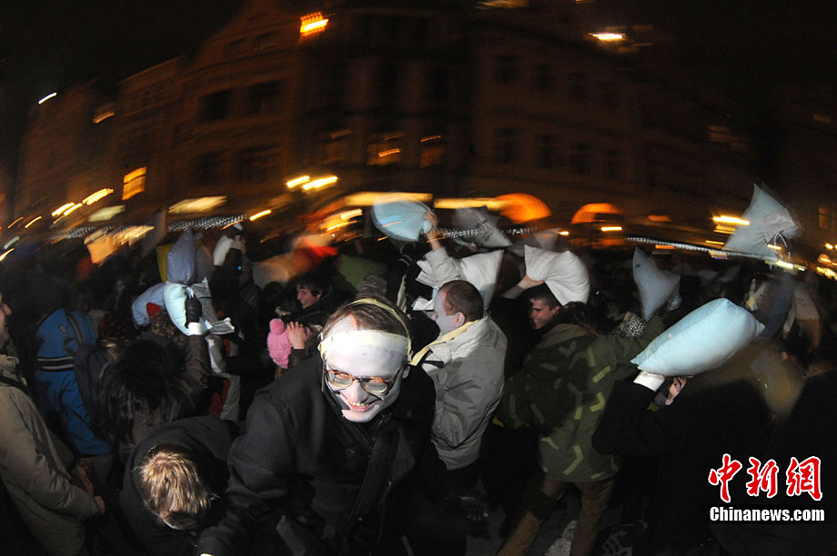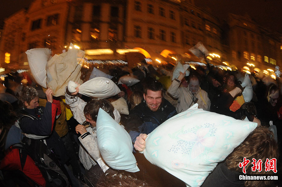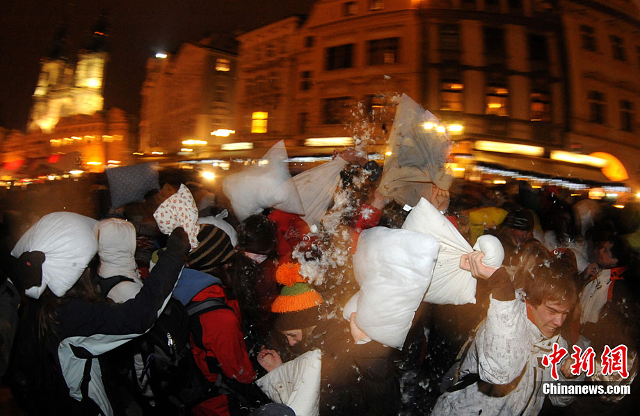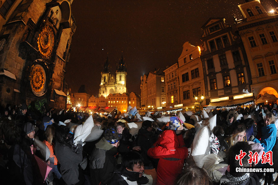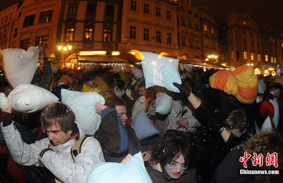 捷克布拉格廣場(chǎng)上演“枕頭大戰(zhàn)”