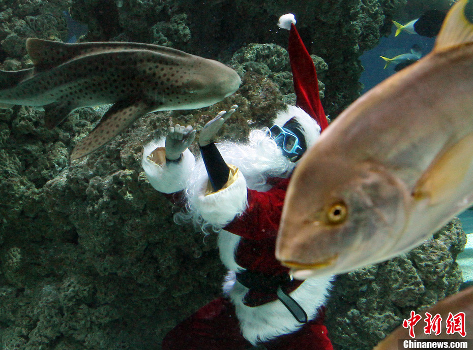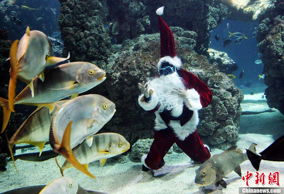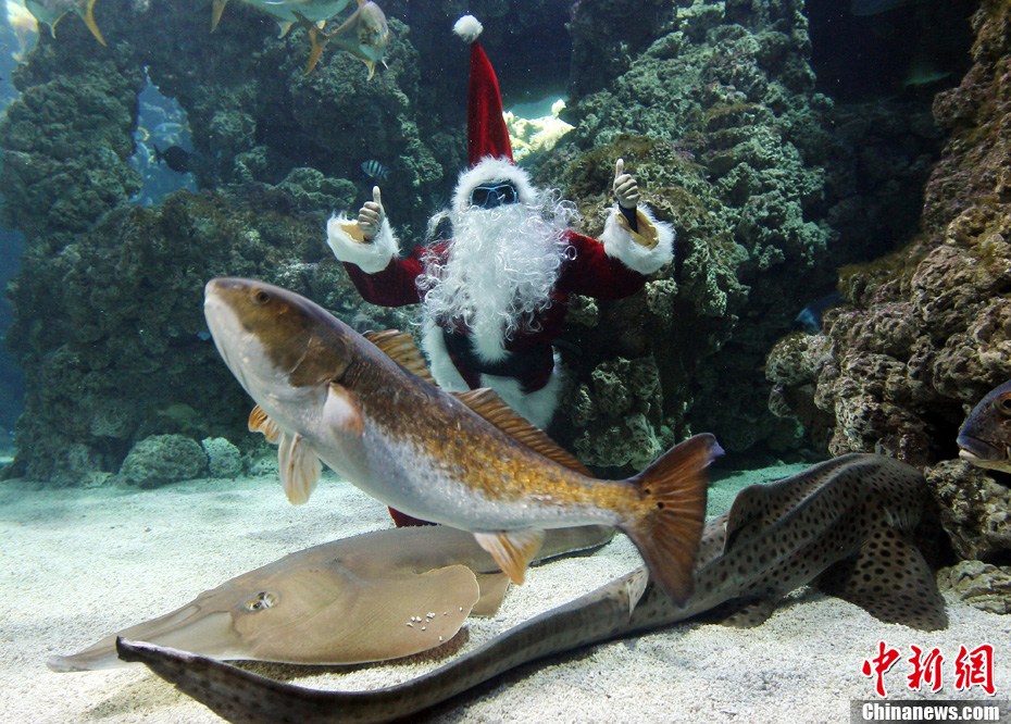 12月17日,摩納哥水族館內(nèi),自由潛水世界紀(jì)錄保持者弗若拉打扮成圣誕老人,在水下與魚兒親密接觸迎接圣誕節(jié)。