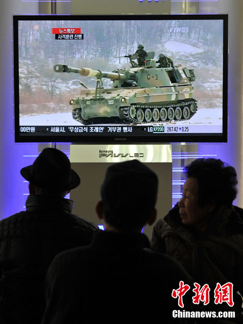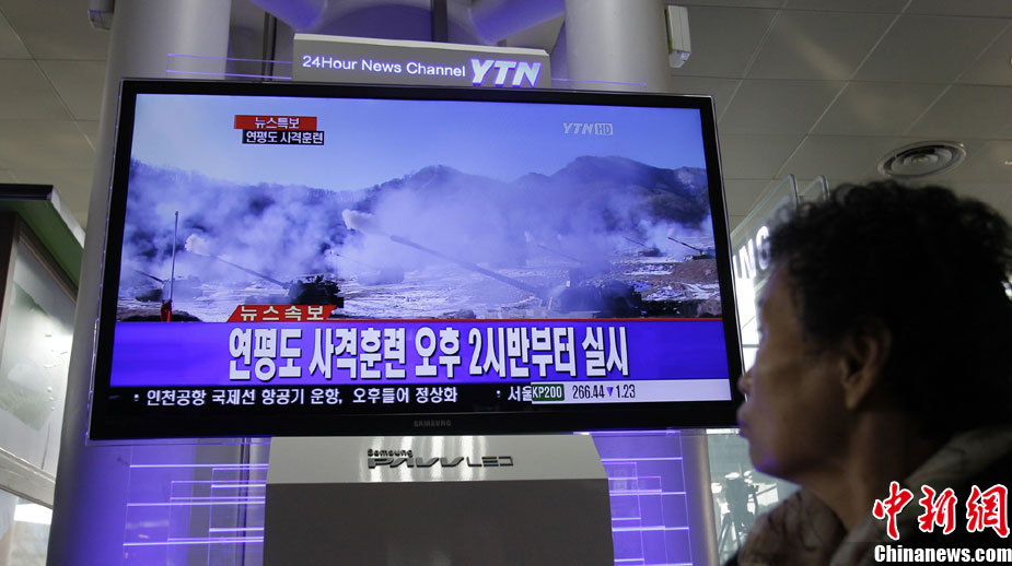 12月20日,韓國軍方開始在延坪島舉行海上實(shí)彈射擊訓(xùn)練。圖為韓國民眾在電視上收看演習(xí)訓(xùn)練的新聞。