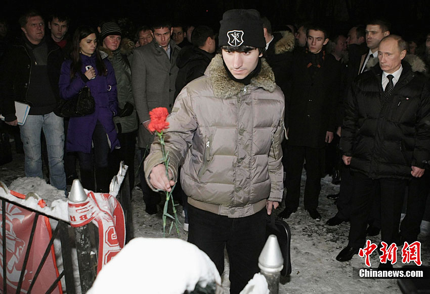 當?shù)貢r間12月21日,俄羅斯總理普京與部分球迷一起,來到日前被槍殺的莫斯科斯巴達克足球俱樂部球迷葉戈爾·斯維里多夫的墓前,獻上鮮花表達哀思。12月5日夜間至6日凌晨,一群斯巴達克隊的球迷與一撥來自北高加索地區(qū)的年輕人在莫斯科北部的喀瑯施塔得林蔭道某汽車站附近發(fā)生斗毆,結(jié)果球迷葉戈爾·斯維里多夫被槍殺身亡。