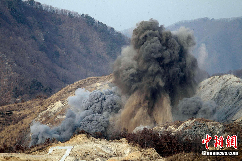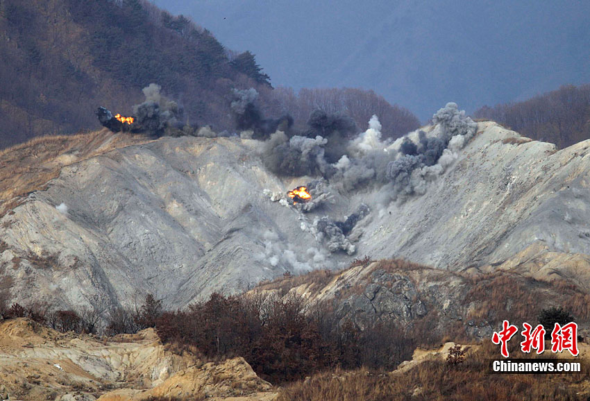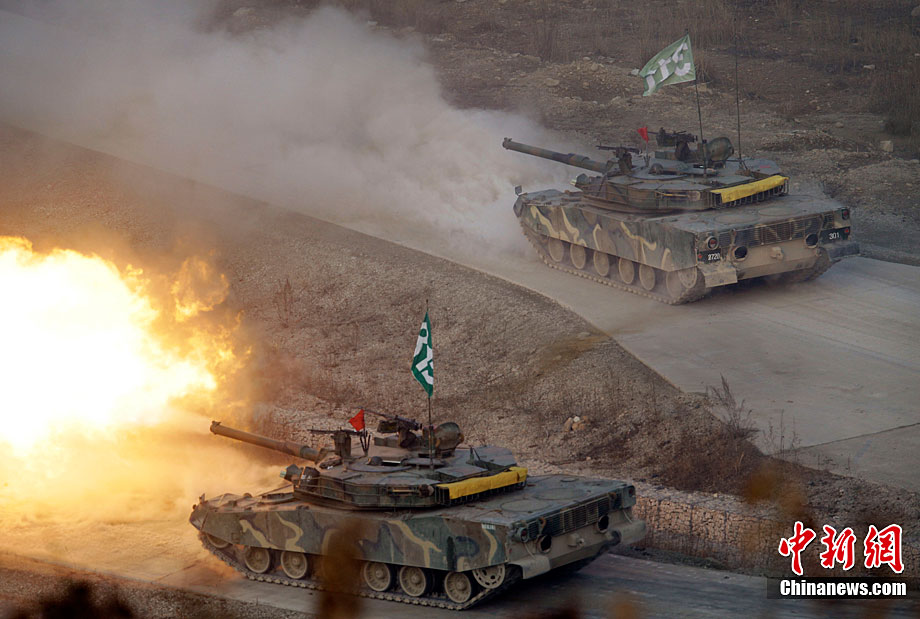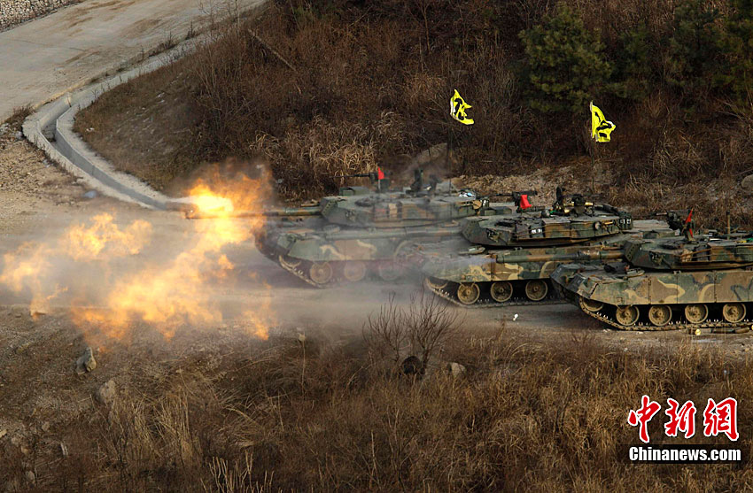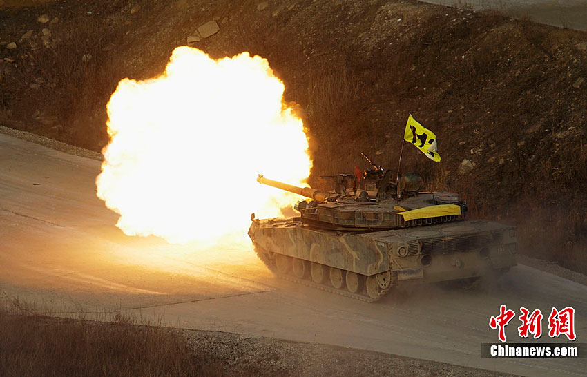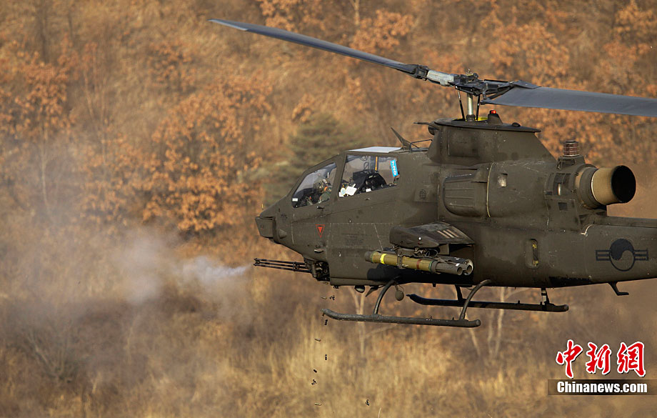 當?shù)貢r間12月23日下午2時43分,韓國軍方最大規(guī)模的陸空聯(lián)合實彈射擊演練開始。據(jù)悉,此次演習(xí)投入800名官兵,動員6架F-15K和KF-16戰(zhàn)斗機、K-1戰(zhàn)車、AH-1S攻擊型直升機、K-9自走炮、反戰(zhàn)車導(dǎo)彈和多管火箭發(fā)射系統(tǒng)等105種火力裝備。圖為AH-1S攻擊型直升機在進行射擊。