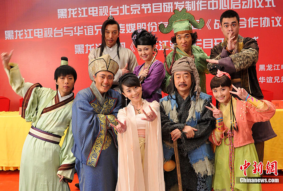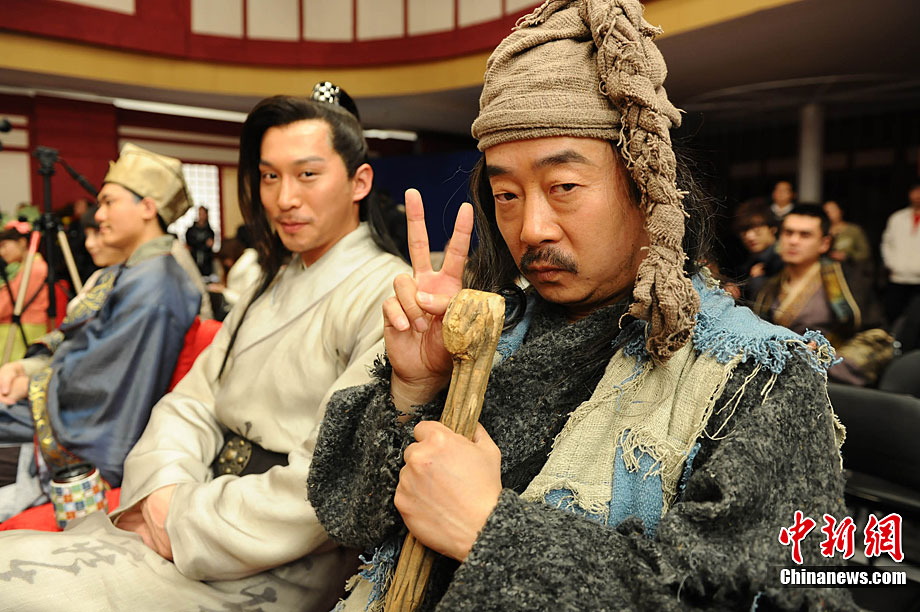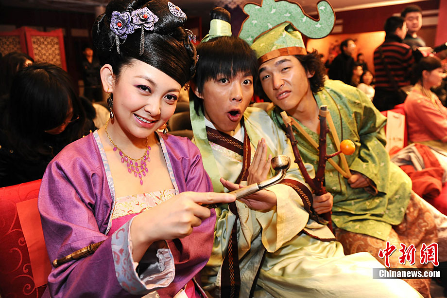 12月28日,古裝娛樂欄目劇《快樂江湖》在黑龍江電視臺北京節(jié)目研發(fā)制作中心正式開機。該劇由黑龍江電視臺與華誼兄弟聯(lián)手打造,講述了幾個現(xiàn)代人“穿越”到唐代的無厘頭爆笑故事。圖為劇中的“無厘頭”演員團隊。中新社記者 李學(xué)仕 攝