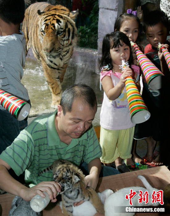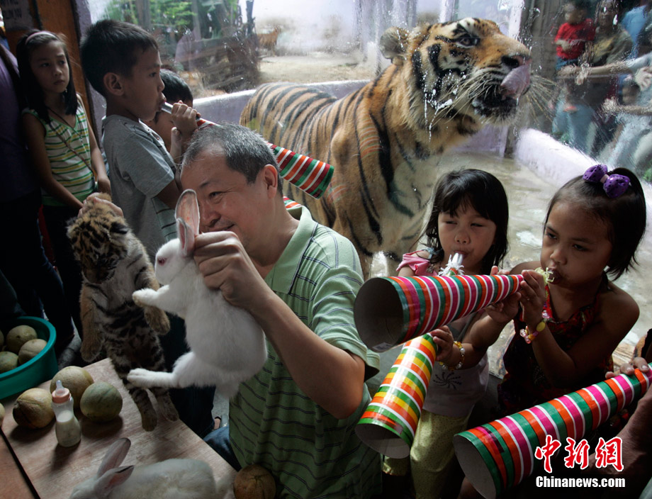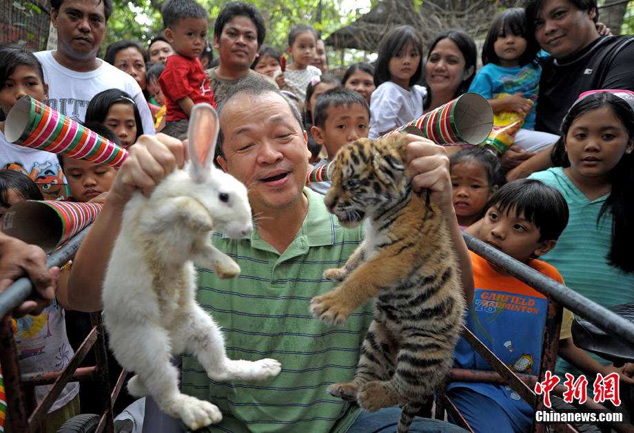 12月28日,菲律賓首都馬尼拉北部的馬拉邦動(dòng)物園,一名工作人員抓起老虎幼崽和兔子向游客展示。許多亞洲國(guó)家都有慶祝農(nóng)歷新年的習(xí)俗,人們即將告別虎年,迎來(lái)兔年。