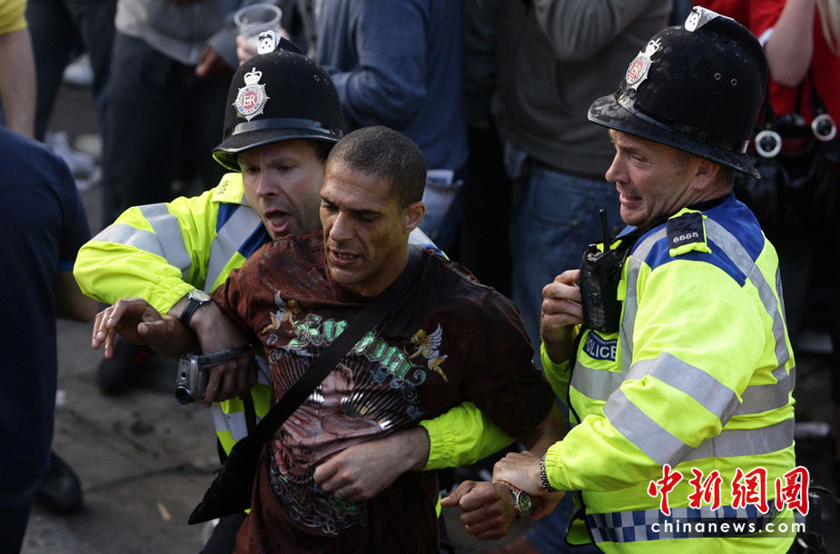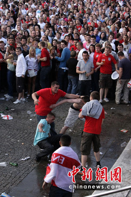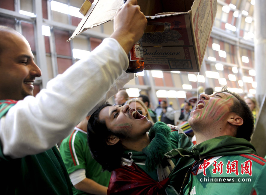 6月11日,南非世界杯揭幕戰(zhàn)在約翰內(nèi)斯堡足球城球場(chǎng)舉行,中場(chǎng)休息時(shí)球迷在休息區(qū)舉箱豪飲啤酒。中新社記者 廖攀 攝
