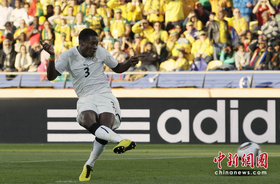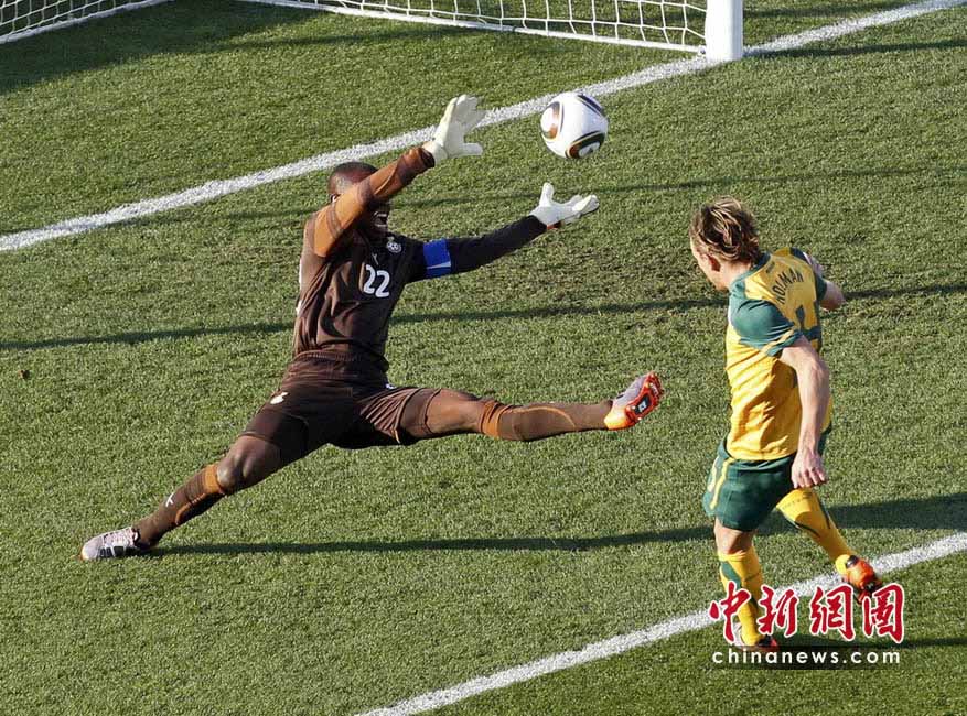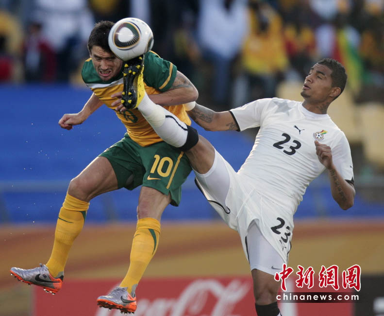 6月19日,世界杯D組第2輪一場小組賽在勒斯騰堡的皇家班佛肯球場展開,加納隊迎戰(zhàn)澳大利亞隊。最終被罰下一人的澳大利亞隊1比1逼平加納。