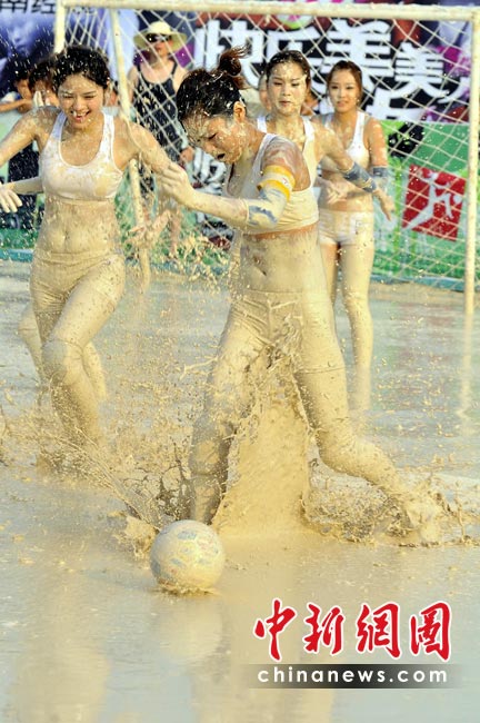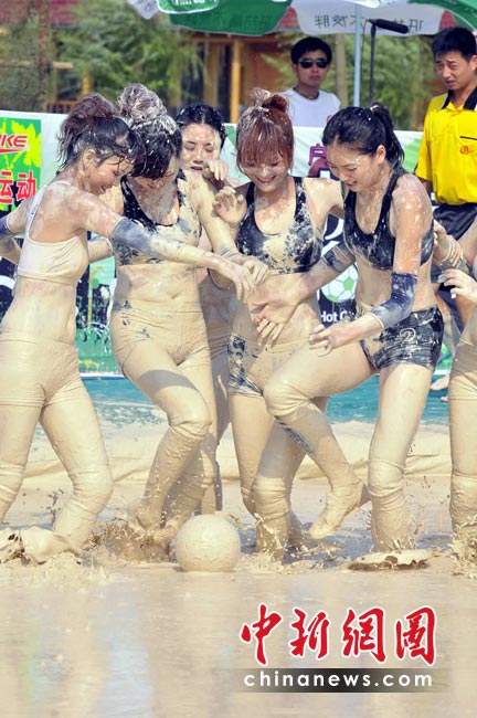 南非世界杯戰(zhàn)火越燃越烈,各地的世界杯熱潮也席卷而來。近日,一檔比基尼美女足球賽在長沙開鑼,和世界杯男足不同的是,美女們是在泥漿中比賽。據悉,這檔名為《快樂美美向前沖》的足球賽已在湖南經視播出。節(jié)目中,為了順利闖關,眾美女不顧形象,在泥漿中匍匐前進和翻滾,引得觀眾爆笑如雷。圖為首場比賽中,湖南隊美女與湖北隊美女在連闖四關后,進入泥漿場內進行終極球賽PK。湖南經視供圖