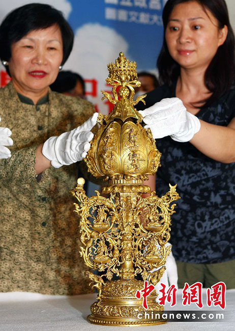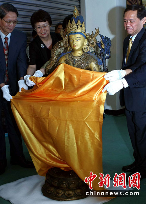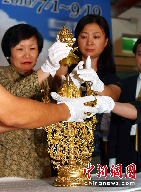 6月25日,工作人員將“鎏金銅彌勒菩薩像”、“金翅白海螺法號(hào)”、“八瓣蓮花曼荼鑼”等3件重量級(jí)文物開(kāi)箱。7月1日,臺(tái)灣故宮博物院將舉辦“圣地西藏---最接近天空的寶藏”特展,展覽分“吐蕃王朝”、“金色寶藏”、“文化交流”、“雪域風(fēng)情”四部分,共有130組件文物參展。中新社記者 宋吉河 攝