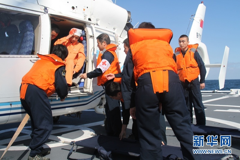 “和平方舟”醫(yī)院船上的醫(yī)護(hù)人員從直升機(jī)上運(yùn)送“受傷”人員。王經(jīng)國 攝 圖片來源:新華網(wǎng)
